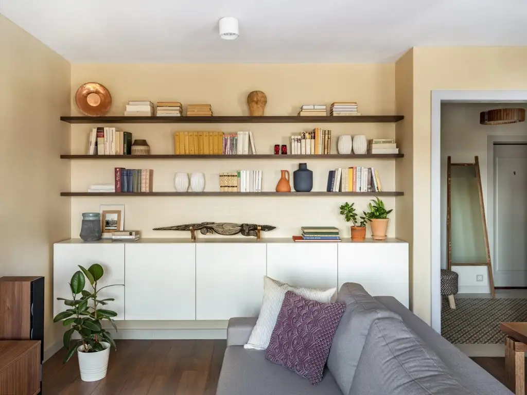 Living-ul descrie cu exactitate imaginea unui spatiu de relaxare pozitionand central o canapea confortabila iar in vecinatatea acesteia o biblioteca generoasa, perfecta pentru depozitarea materialelor dedicate lecturii.