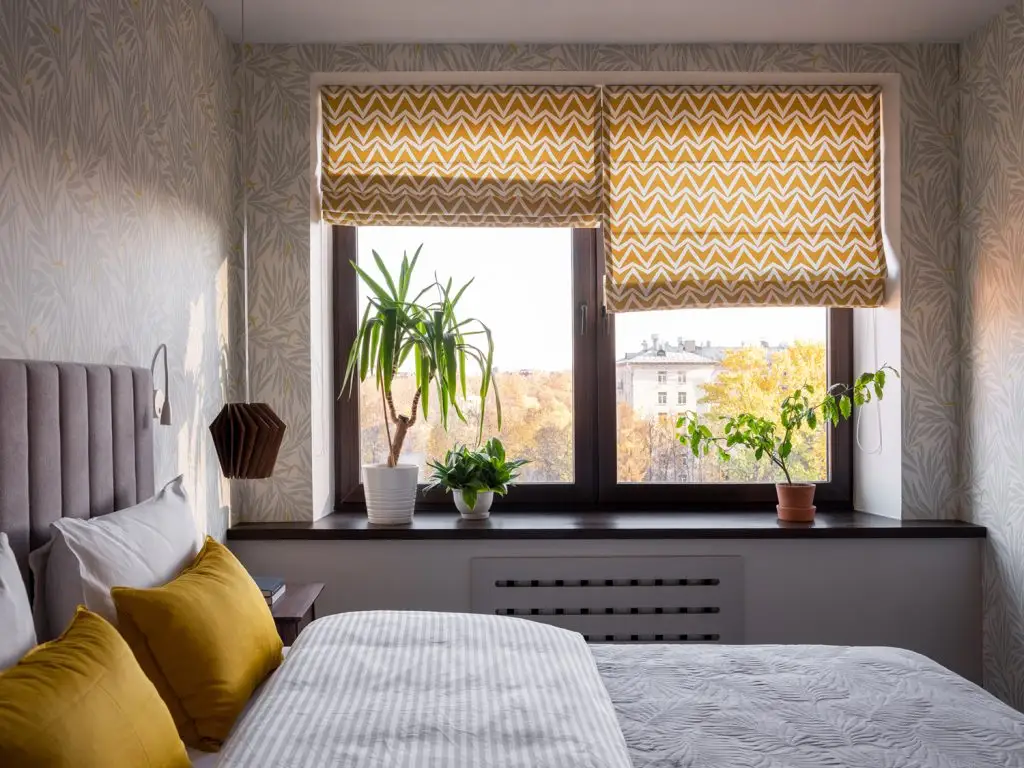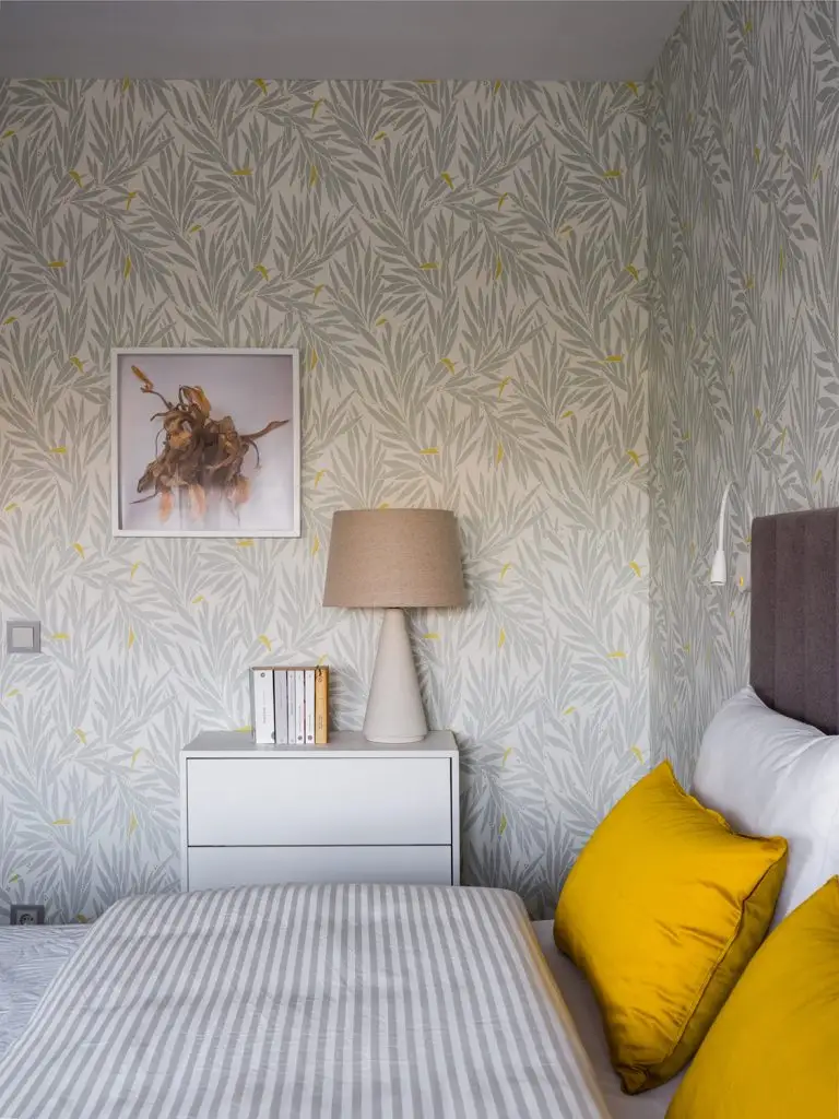 Dormitorul matrimonial respecta coloristica stilului scandinav: galben, gri, turcoaz si isi contureaza o poveste proprie prin aducerea in prim plan a elementelor ce infatiseaza natura in cel mai simplu mod.