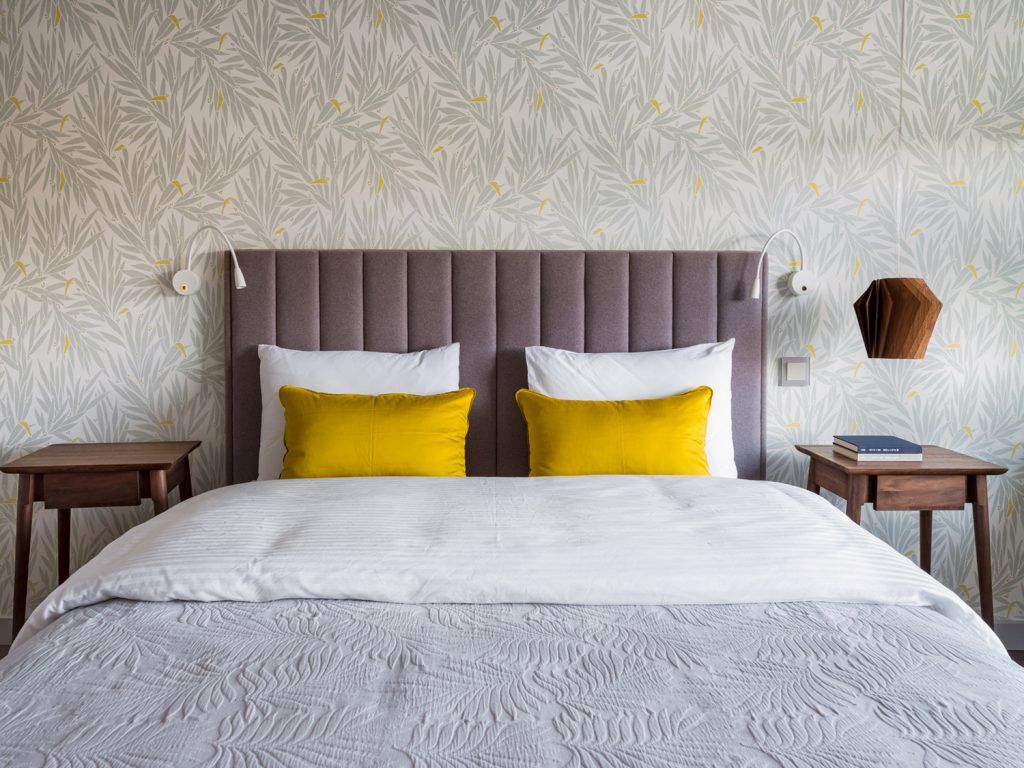 Dormitorul matrimonial respecta coloristica stilului scandinav: galben, gri, turcoaz si isi contureaza o poveste proprie prin aducerea in prim plan a elementelor ce infatiseaza natura in cel mai simplu mod.