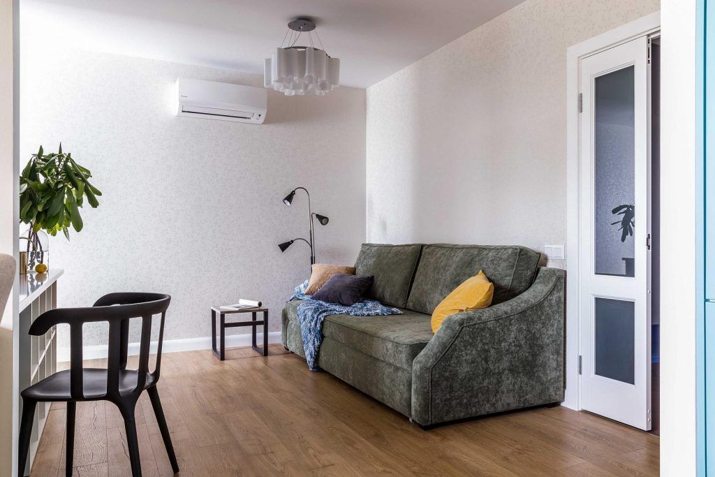 Dupa reamenajare, apartamentul dispune de o bucatarie confortabila, balconul a fost inchis si integrat in spatiul bucatariei ca o zona de lounge, camera mare a fost impartita in dormitor cu acces la lumina naturala si o zona de living cu birou dispusa langa holul de intrare.