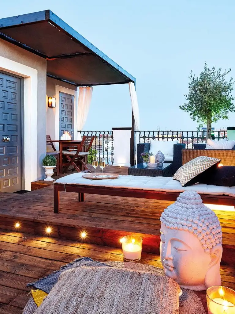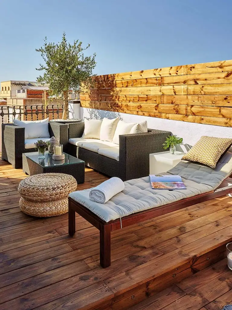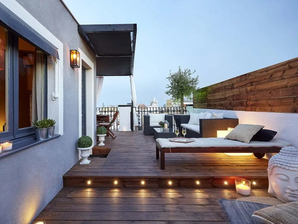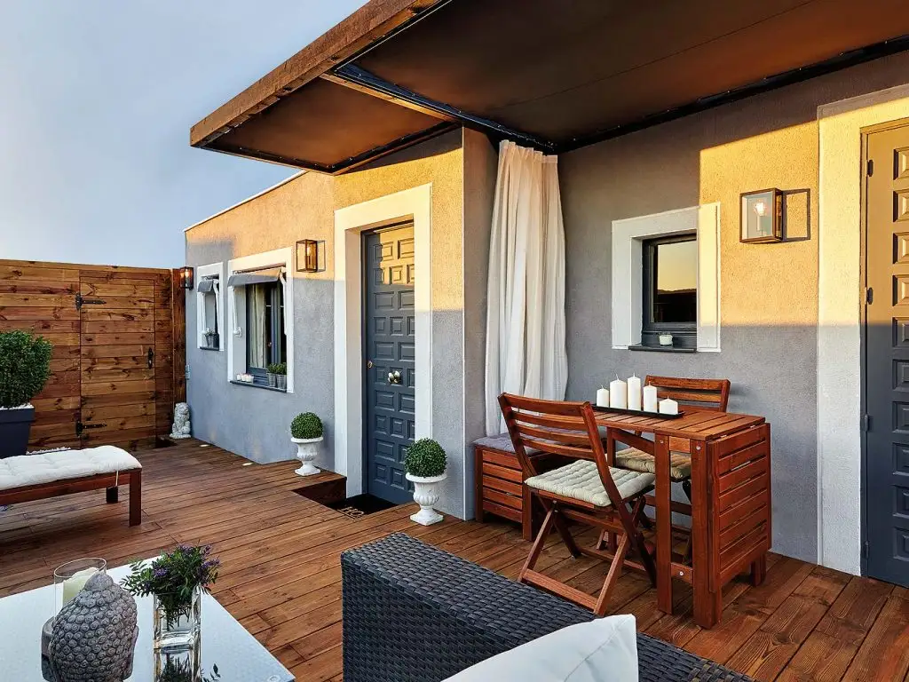 S-a folosit acelasi tip de parchet din lemn stratificat pentru intreaga locuinta, iar la exterior doar dusumea tratata pentru a rezista anotimpurilor, fie soare arzator, fie ploaie. Amenajarea se afla in Barcelona, Spania, asa ca terasa poate fi folosita aproape tot timpul anului, gratie climei mai blande iarna.