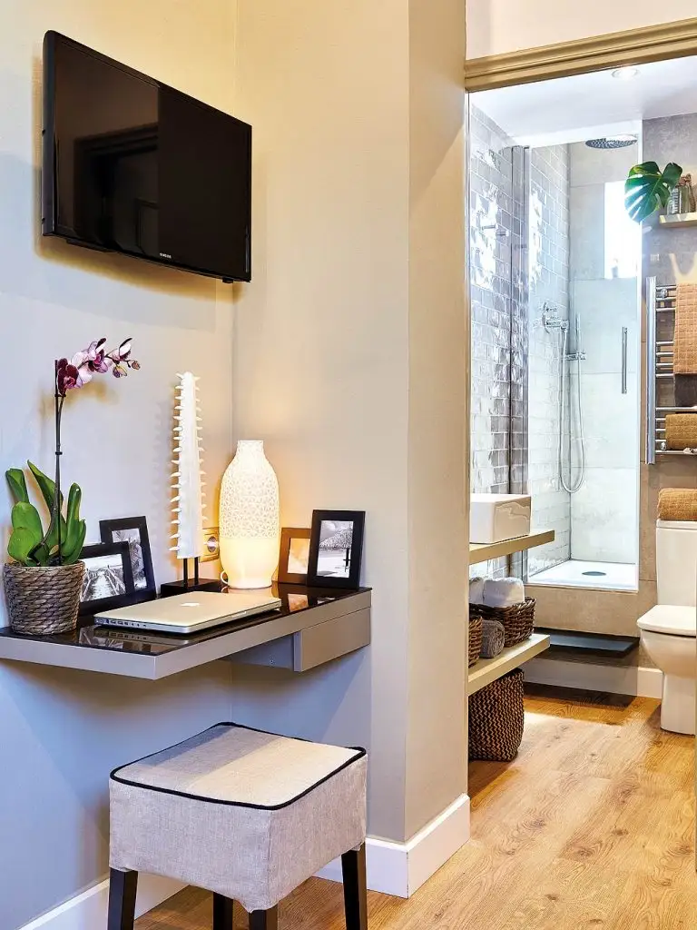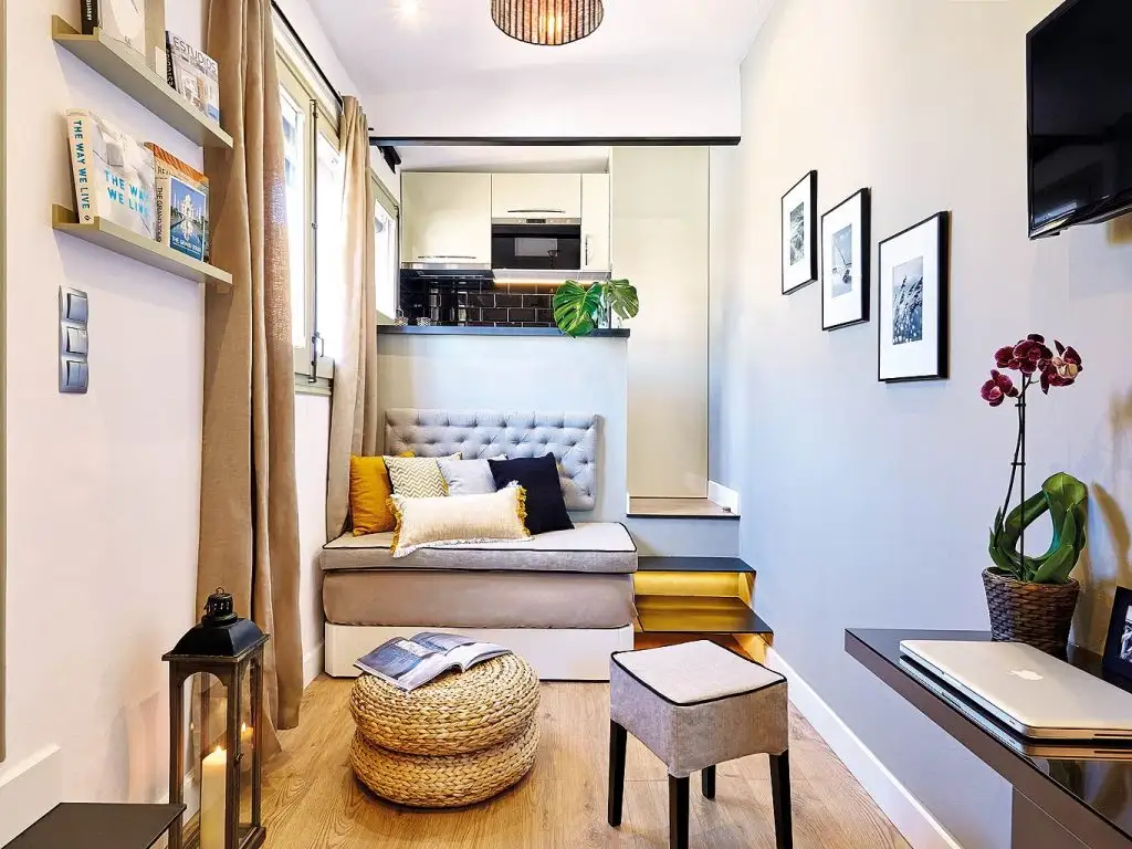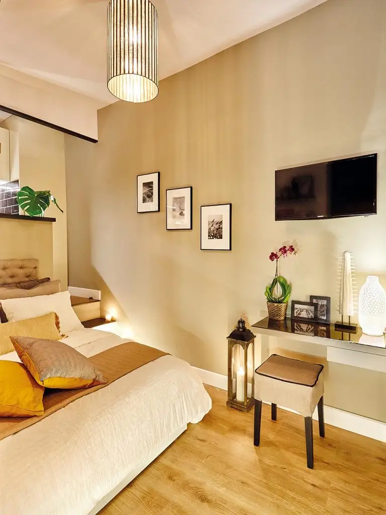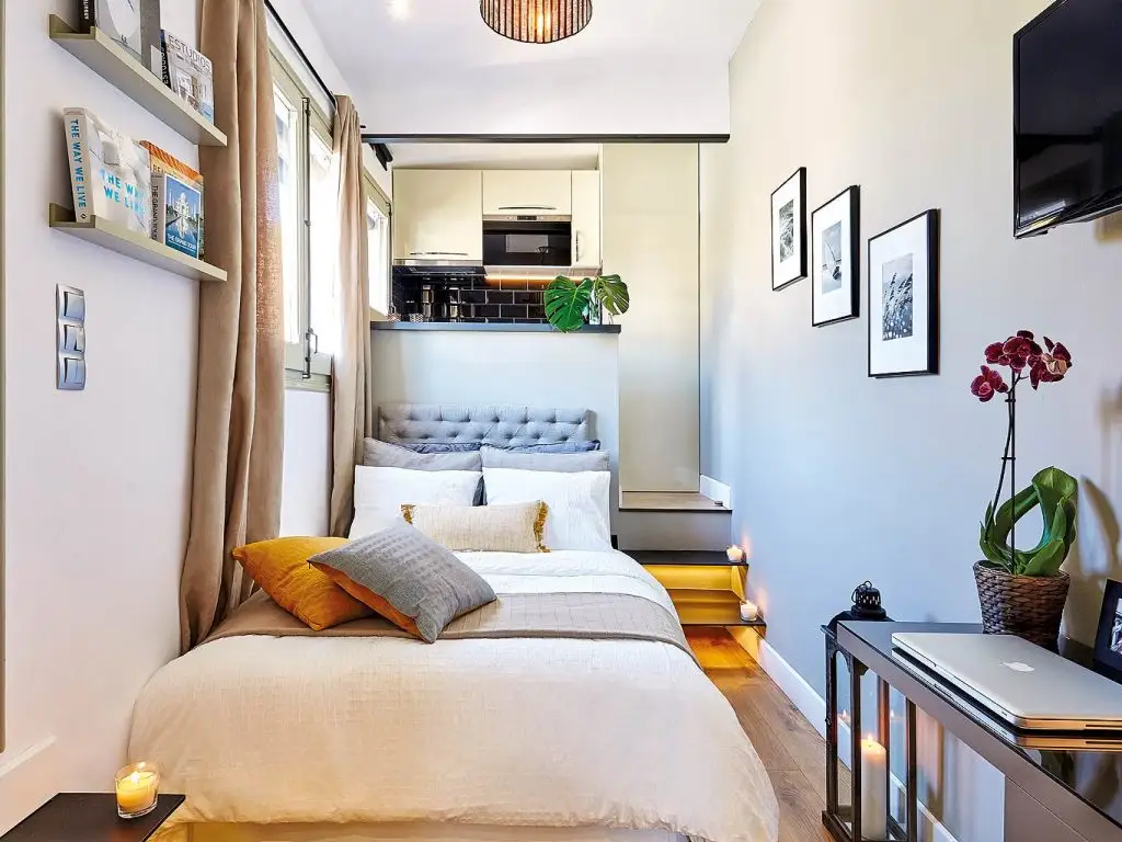 Spatiul micului apartament a fost gandit pentru a fi utilizat in conditii optime. Avem zona de gatit dotata cu toate cele necesare, inclusiv electrocasnice incorporate in mobilier. Restul camerei lasa loc patului extensibil, dar si unor mici accesorii ce completeaza decorul intr-un mod foarte placut. Cu toata aceasta ingramadire de functiuni, spatiul ramane aerisit si fluent.