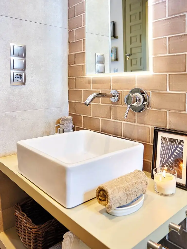 Pentru zona de baie s-a apelat la aceeasi solutie de inaltare, de data aceasta pentru a amenaja cabina de dus, vasul de toaleta si lavoarul fiind separate tocmai prin aceasta diferenta de nivel. Separarea baii de restul camerei se face printr-o usa glisanta.