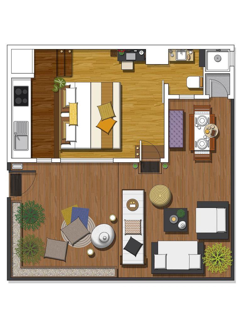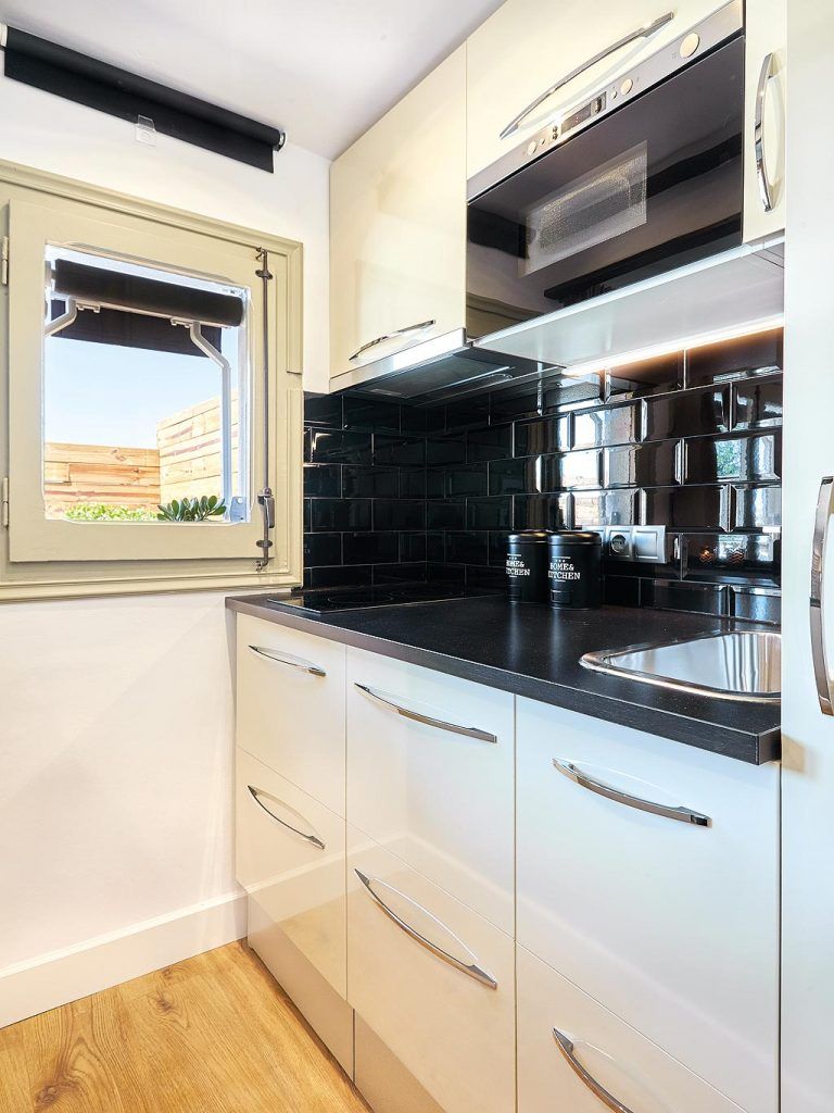 Spatiul micului apartament a fost gandit pentru a fi utilizat in conditii optime. Avem zona de gatit dotata cu toate cele necesare, inclusiv electrocasnice incorporate in mobilier. Restul camerei lasa loc patului extensibil, dar si unor mici accesorii ce completeaza decorul intr-un mod foarte placut. Cu toata aceasta ingramadire de functiuni, spatiul ramane aerisit si fluent.
