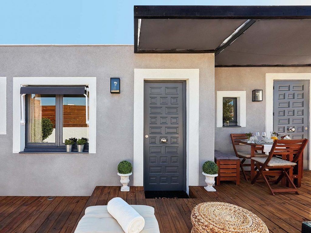 S-a folosit acelasi tip de parchet din lemn stratificat pentru intreaga locuinta, iar la exterior doar dusumea tratata pentru a rezista anotimpurilor, fie soare arzator, fie ploaie. Amenajarea se afla in Barcelona, Spania, asa ca terasa poate fi folosita aproape tot timpul anului, gratie climei mai blande iarna.