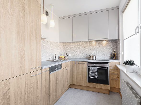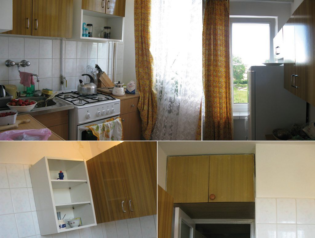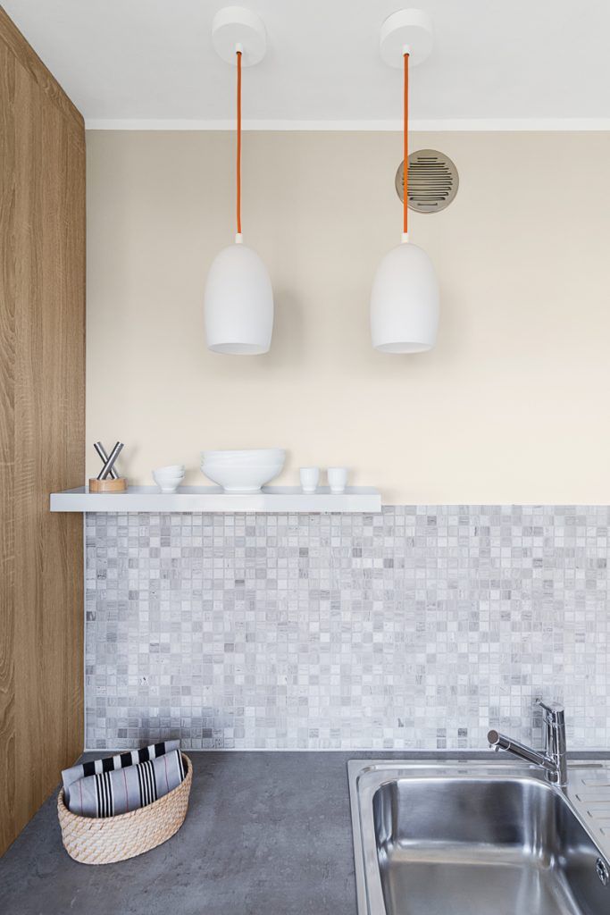 Bucataria de dimensiuni reduse a fost optimizata prin folosirea culorilor deschise si a fronturilor din MDF lucios care fac spatiul sa para mai mare. Decorul obtinut este unitar si aerisit, fiecare colt fiind exploatat in totalitate. Electrocasnicele sunt incorporate in mobilier, iar portiunea dintre blat si corpurile suspendate a fost decorata cu un mozaic ce reuseste sa creeze un efect dinamic asupra amenajarii.