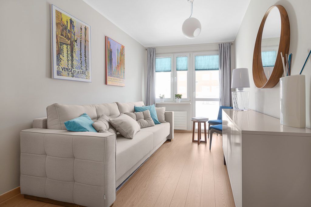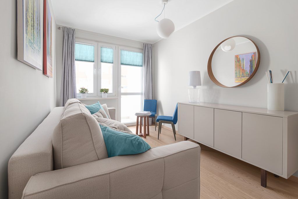 In noul hol creat a fost amenajat un dressing pentru depozitarea hainelor. Zona dedicata dormitorului a fost conturata intr-un mod asemanator livingului, fiind un decor ce nu te duce cu gandul neaparat la o zona de noapte. Canapeaua pentru care s-a optat este extensibila, iar comoda ofera un plus de depozitare. Accentele de albastru induc o stare de relaxare in ambientul creat.