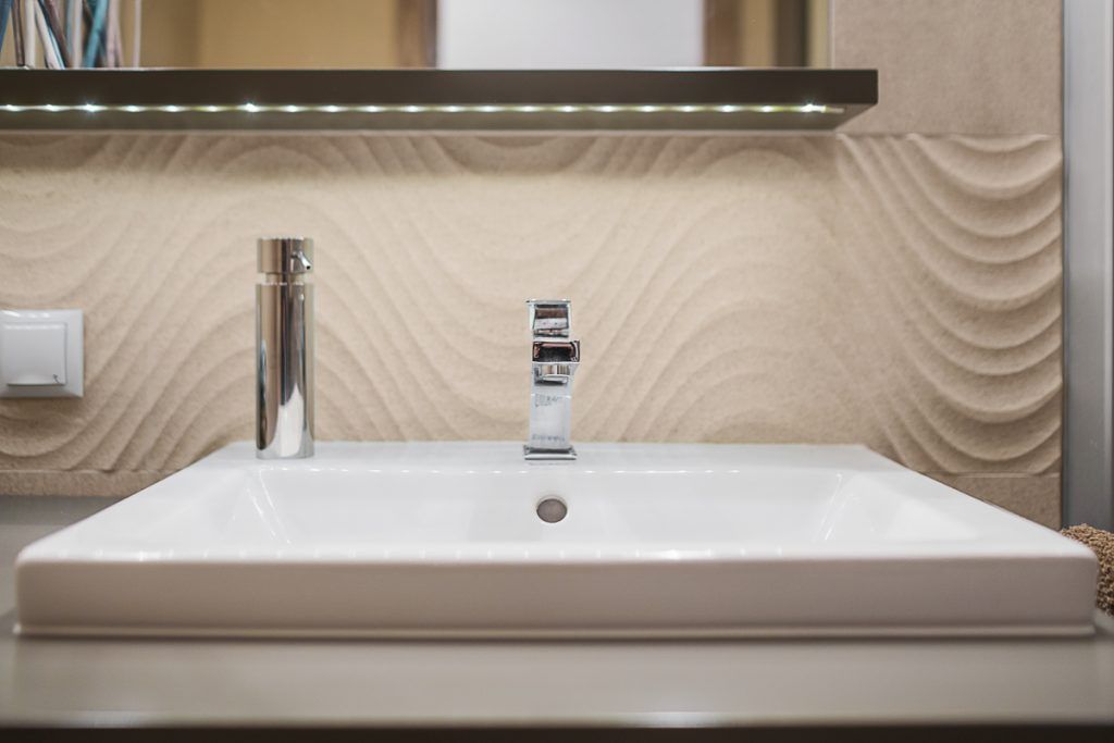 Cromatica calda este preluata si in baie. S-a reusit optimizarea spatiului prin inlocuirea cazii cu o cabina de dus. Lavoarul este incadrat intr-o masca care ascunde deopotriva spatiu pentru depozitare sub forma unor sertare de diferite adancimi, dar si masina de spalat.