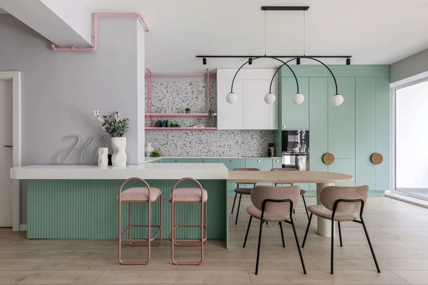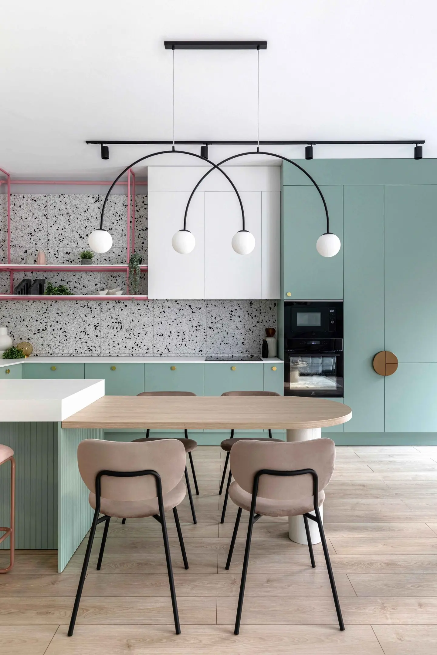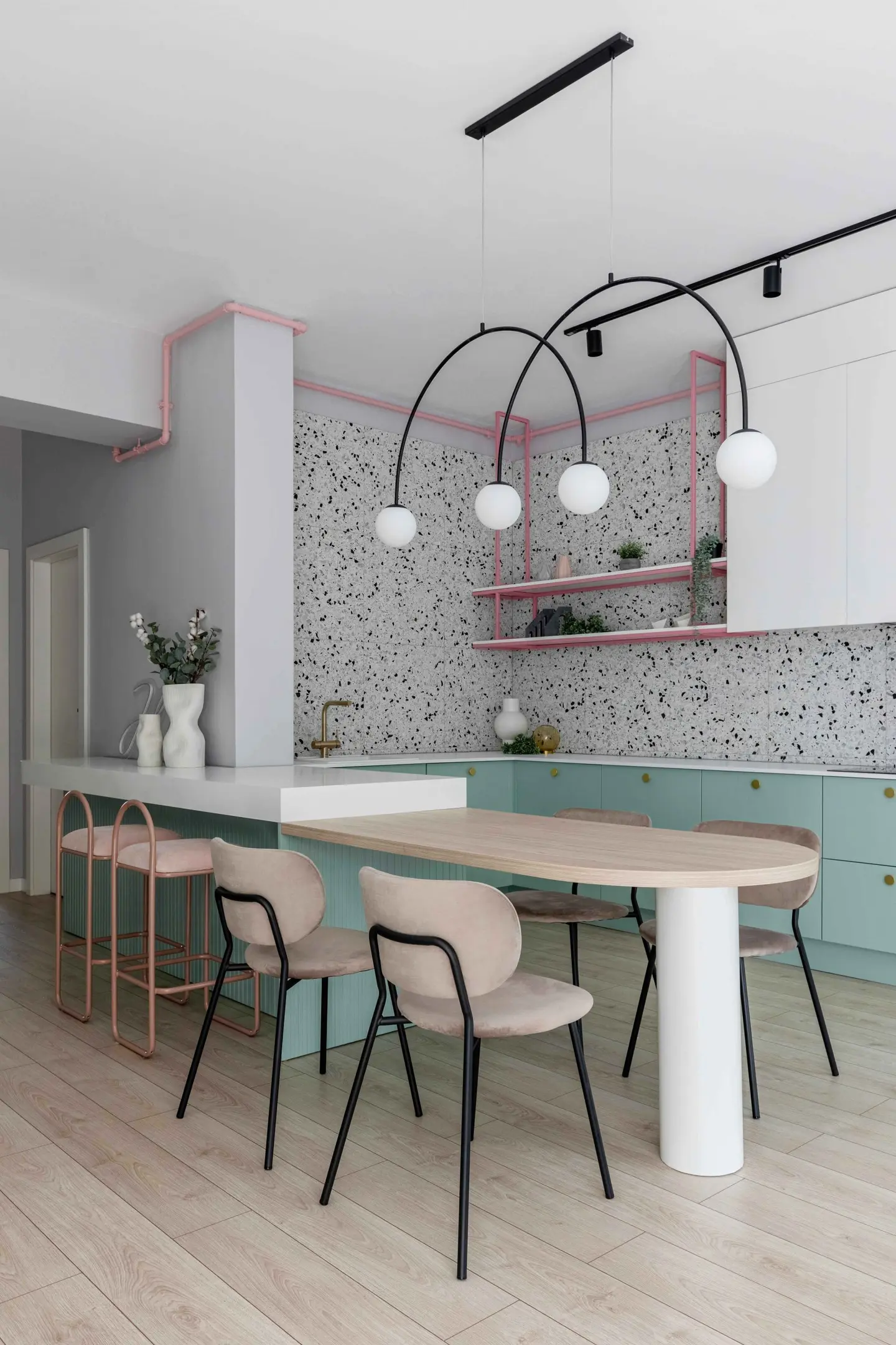 Pornind de la aceste indicații, echipa de design de la Next Interior, condusă de Alexandra Pătrașcu și Adrian Popa, a creat un spațiu care îmbină estetica grupului Memphis cu o paletă cromatică liniștitoare. Bucătăria a devenit punctul central al amenajării, un loc de întâlnire pentru familia extinsă, în timp ce mobilierul și finisajele au fost alese pentru a adăuga caracter și confort.