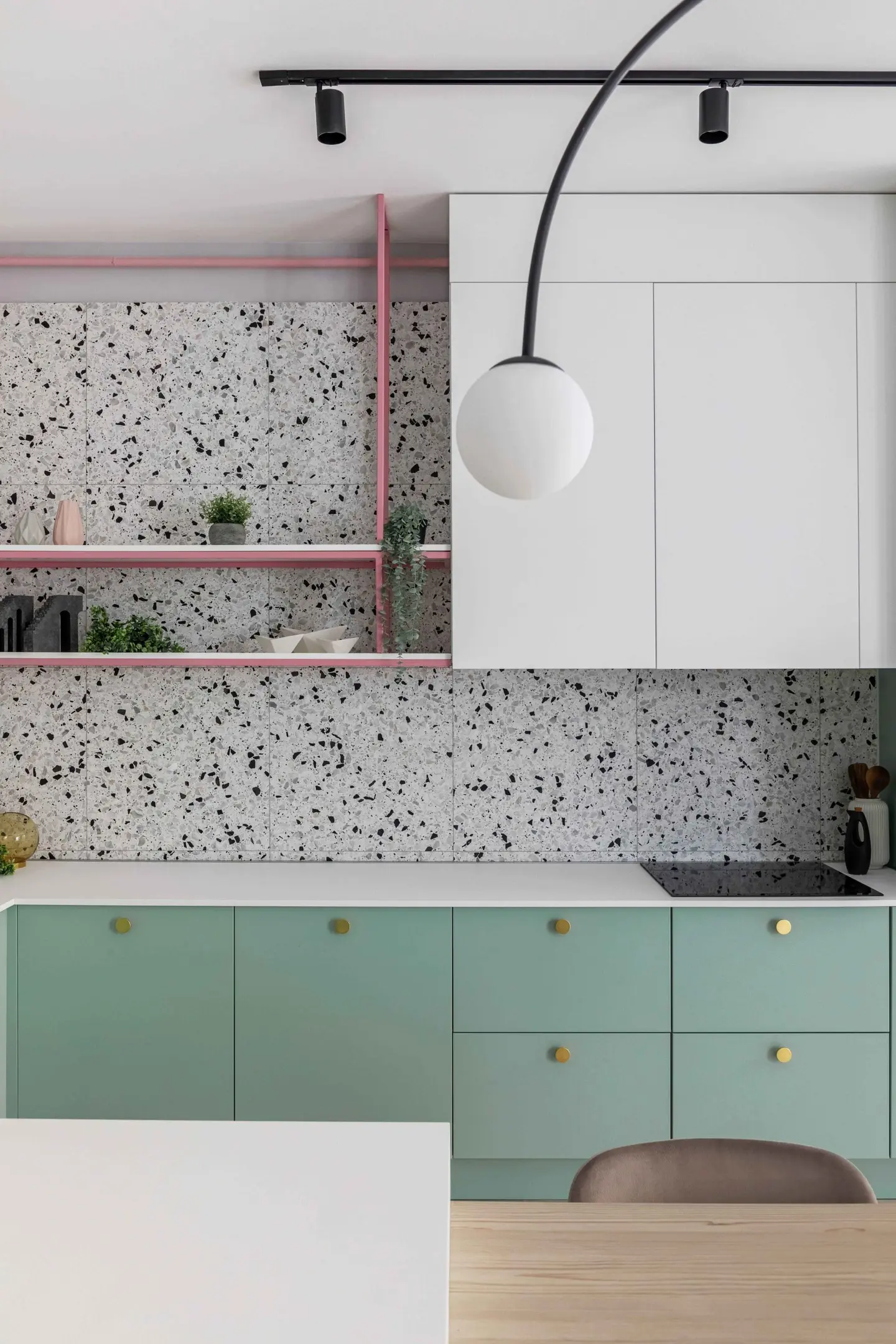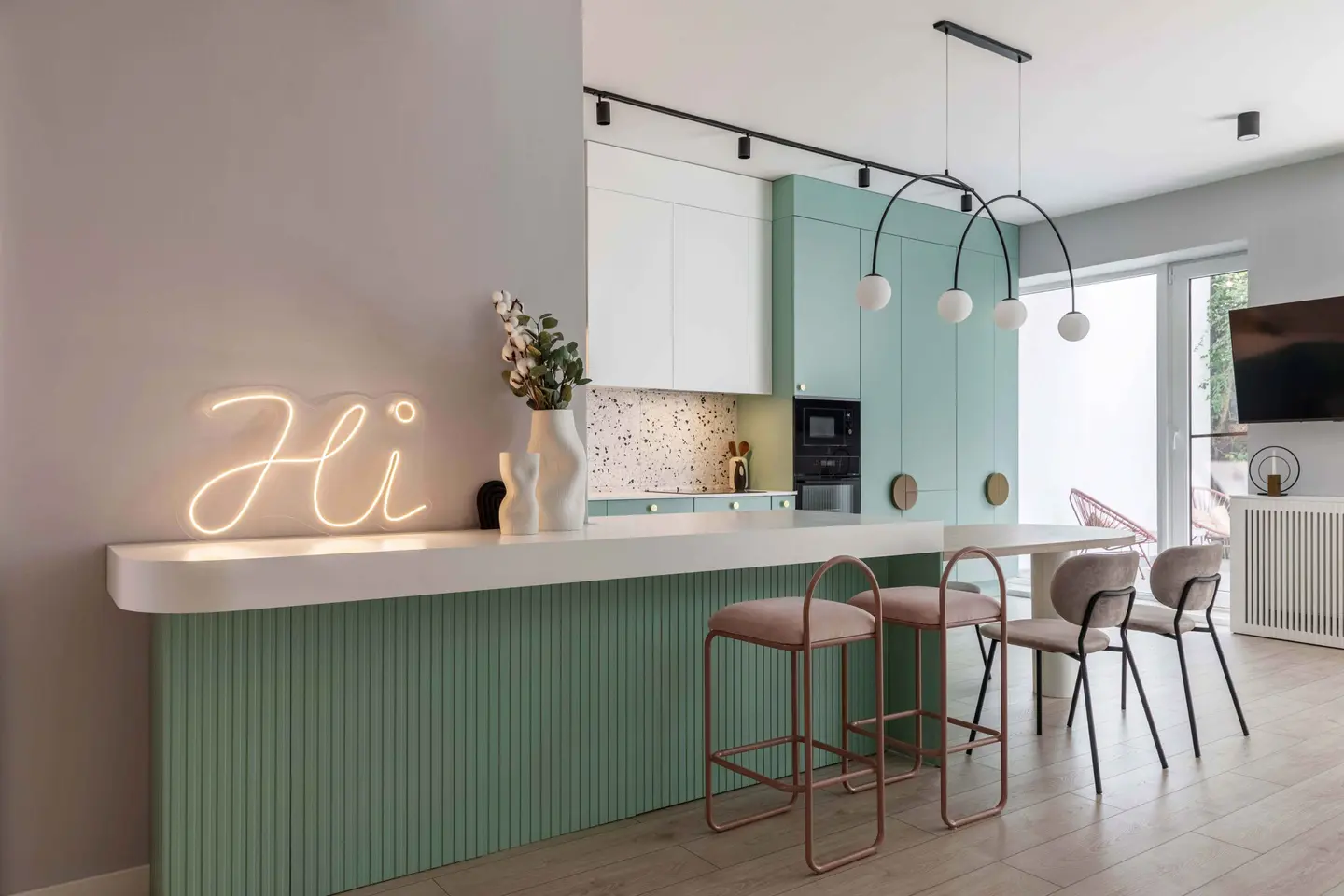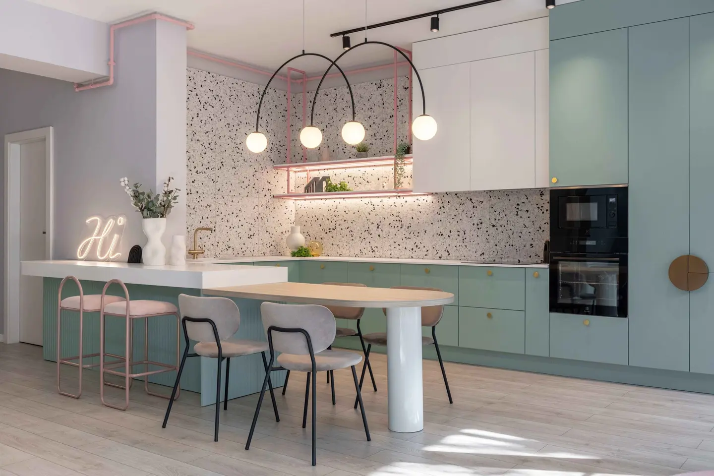Pornind de la aceste indicații, echipa de design de la Next Interior, condusă de Alexandra Pătrașcu și Adrian Popa, a creat un spațiu care îmbină estetica grupului Memphis cu o paletă cromatică liniștitoare. Bucătăria a devenit punctul central al amenajării, un loc de întâlnire pentru familia extinsă, în timp ce mobilierul și finisajele au fost alese pentru a adăuga caracter și confort.