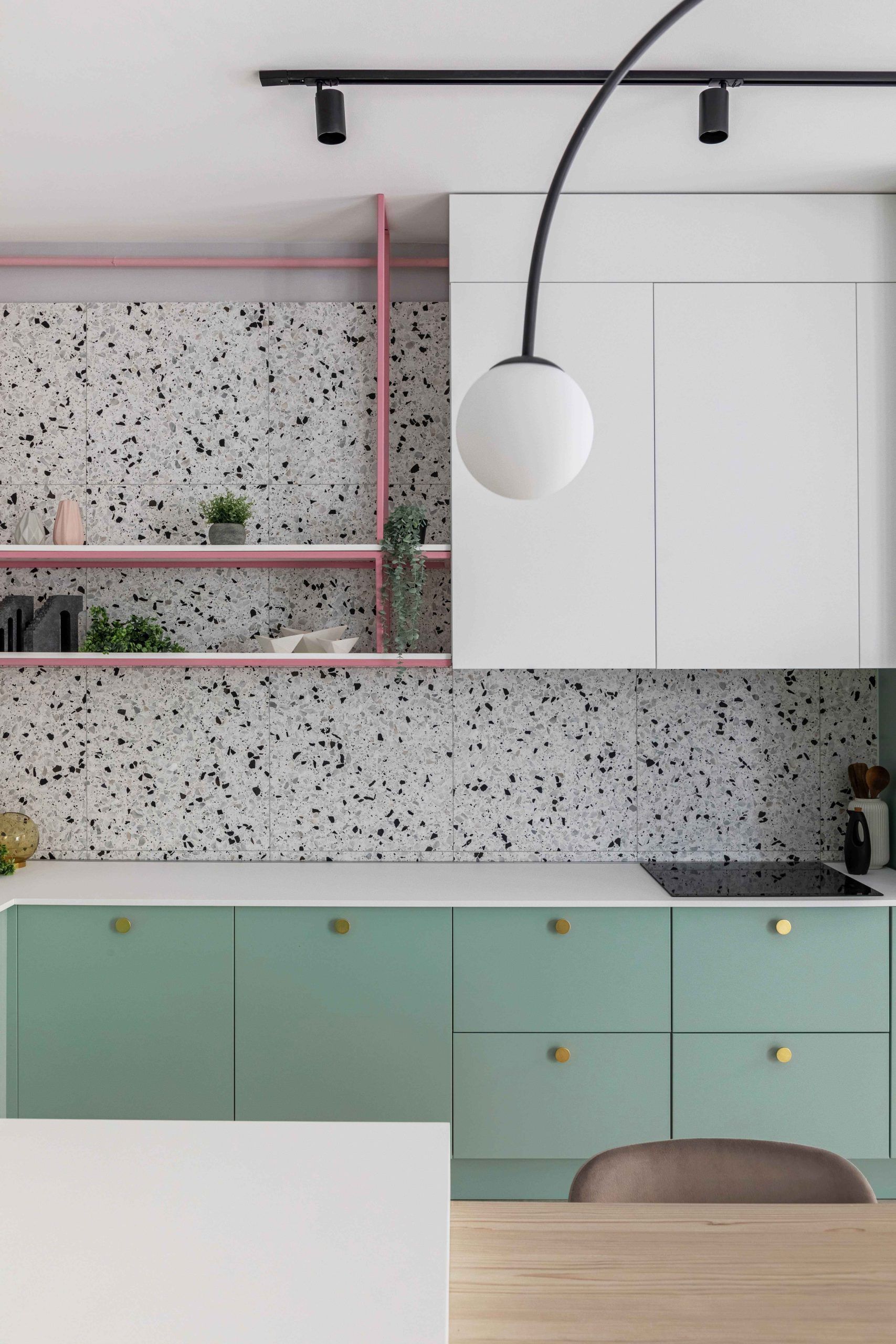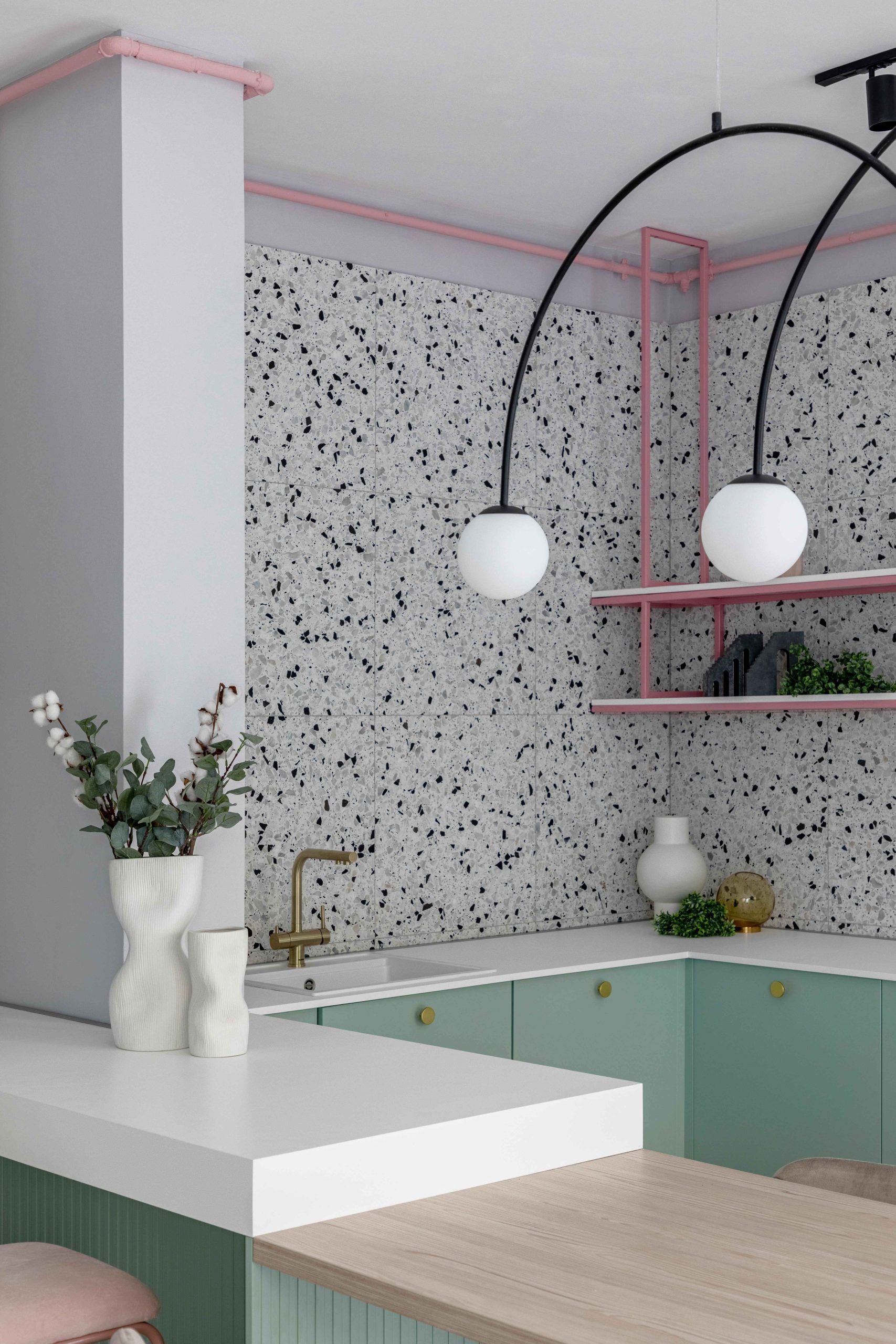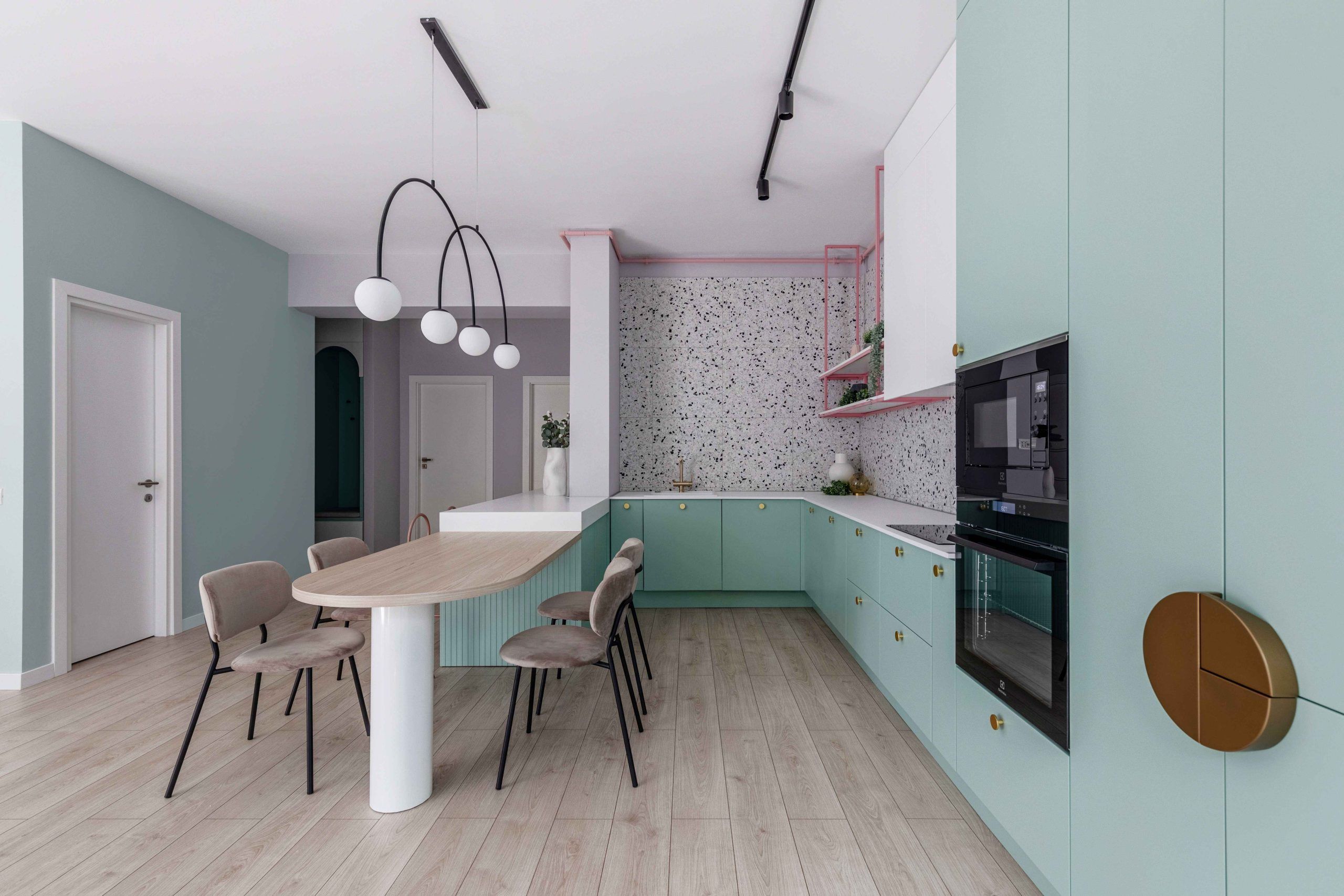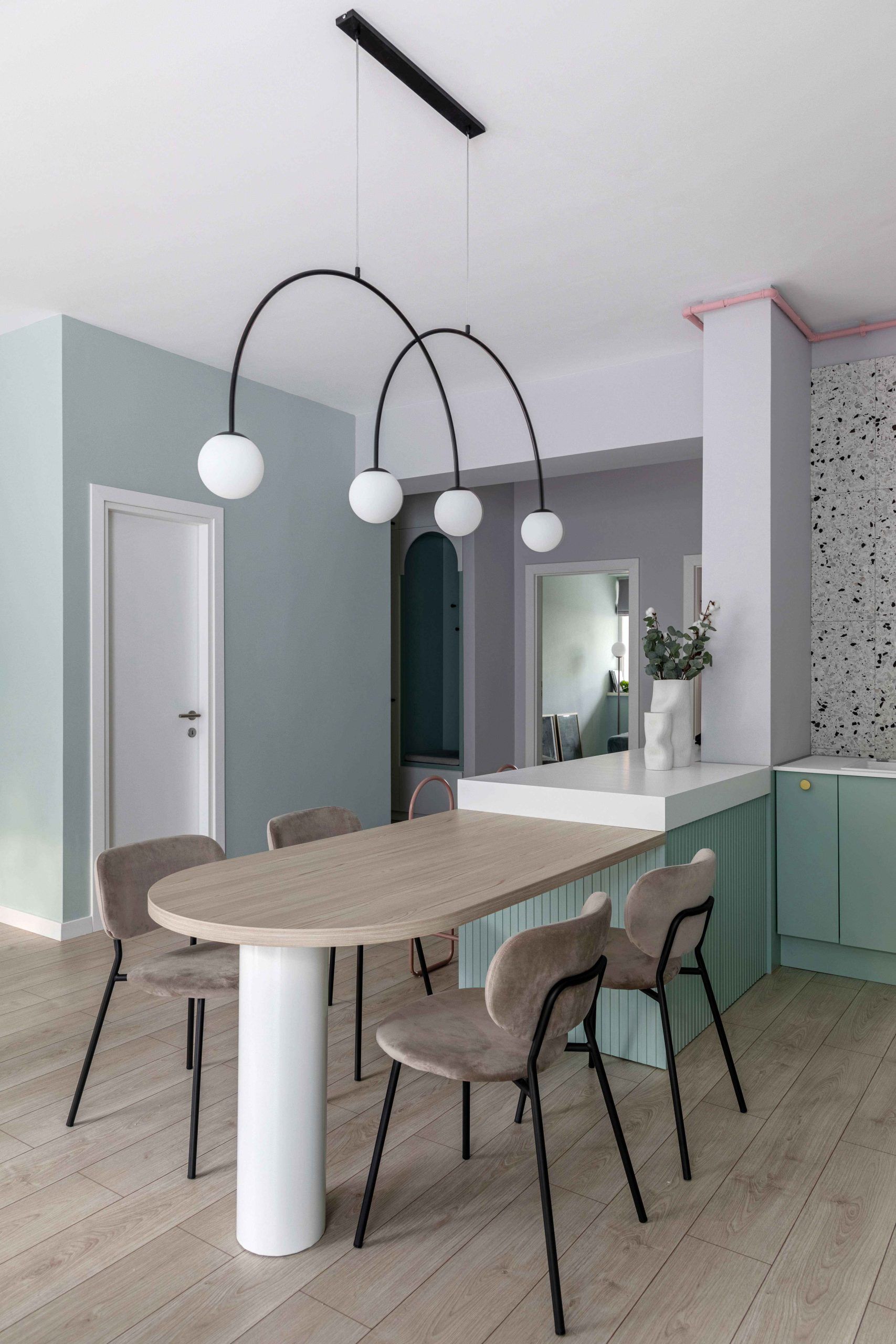 Pornind de la aceste indicații, echipa de design de la Next Interior, condusă de Alexandra Pătrașcu și Adrian Popa, a creat un spațiu care îmbină estetica grupului Memphis cu o paletă cromatică liniștitoare. Bucătăria a devenit punctul central al amenajării, un loc de întâlnire pentru familia extinsă, în timp ce mobilierul și finisajele au fost alese pentru a adăuga caracter și confort.