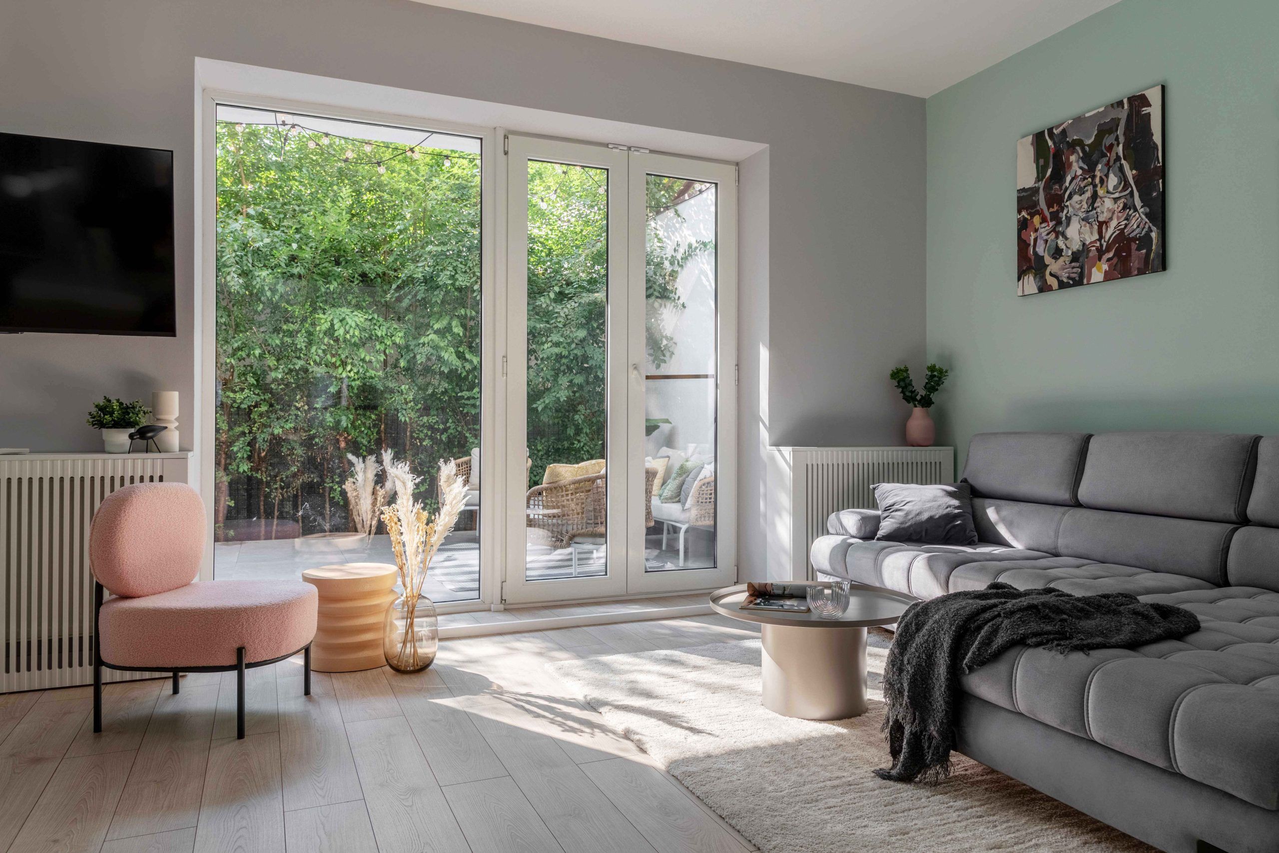 Achiziționat la alb, apartamentul a necesitat o renovare completă pentru a-și atinge potențialul. Printre punctele forte se numără un open space generos și luminos, care a permis crearea unei bucătării spațioase și a două zone de sedere în curte. Însă, apartamentul avea și câteva dezavantaje: dormitoare mici, o baie de serviciu nepractică și finisaje de calitate inferioară. Toate acestea au cerut o abordare creativă și meticuloasă în renovare.