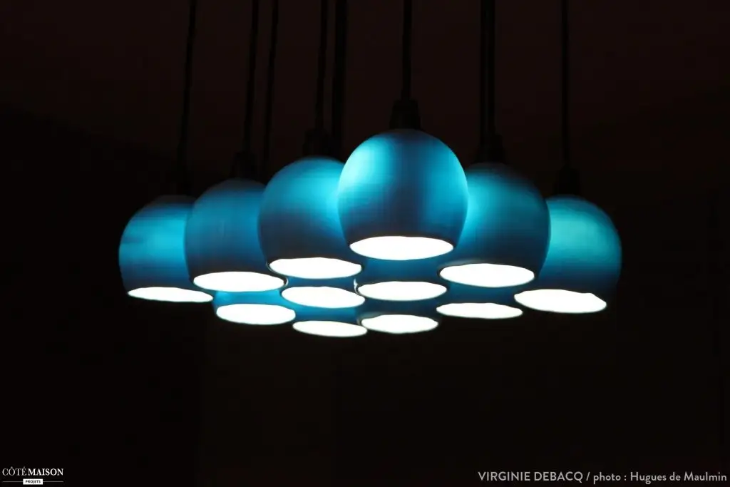 Sistemul de iluminat – un ciorchine de abajururi albastre, este pur si simplu adorabil.