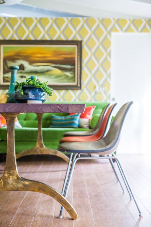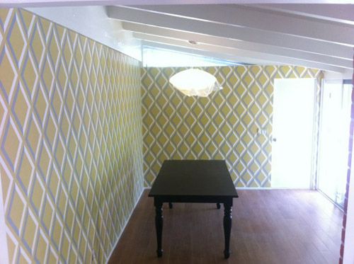 Pentru pereti s-a folosit un tapet cu motive geometrice, culoarea predominanta fiind galbenul. Astfel, camera ofera caldura, veselie si atrage atentia tuturor celor care trec pe acolo.
