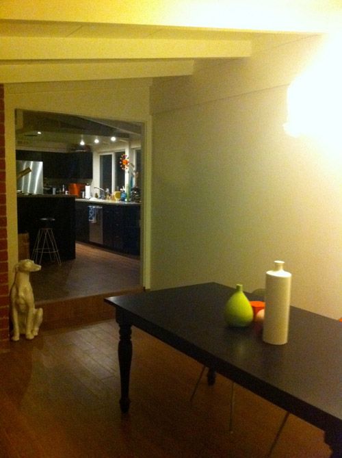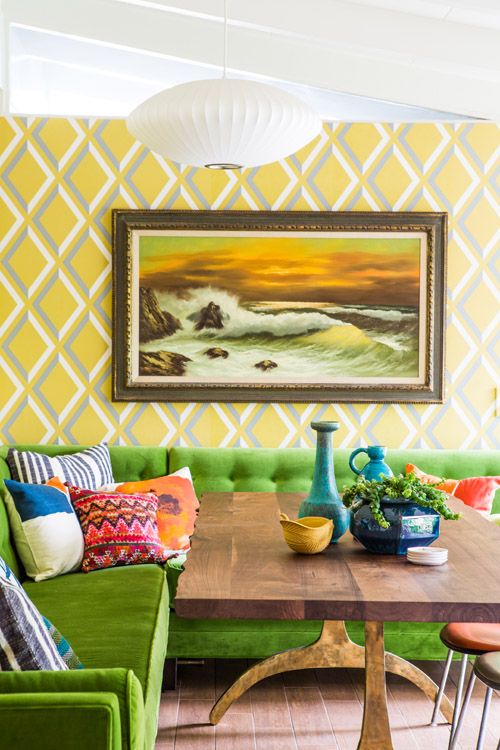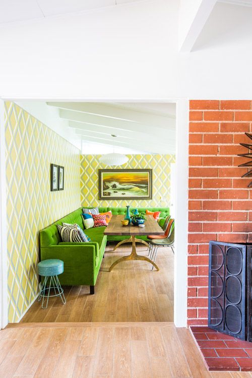 Canapeaua este o veritabila pata de culoare, care imprejmuieste masa de-a lungul ei. Scaunele si corpurile de iluminat existau deja si au fost integrate perfect in noul spatiu.