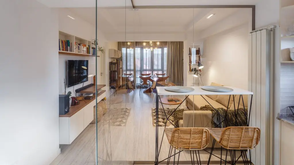 Delimitarea rolurilor celor doua camere se face intr-o maniera nonconformista. Spatiul de pregatire si servire a mesei isi regaseste unitatea si unicitatatea in aceeasi masura, separandu-se cu ajutorul sticlei: o optiune moderna de a pastra legatura celor doua incaperi dar si de a izola fonic si olfactiv.