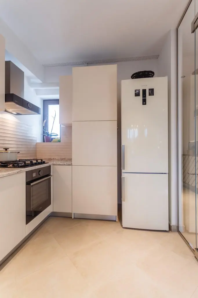Mobilierul este minimalist, compact, in nuante de alb lucios si impreuna cu masa si scaunele de bar cu design modern, plaseaza bucataria intr-un spatiu temporal de actualitate.
