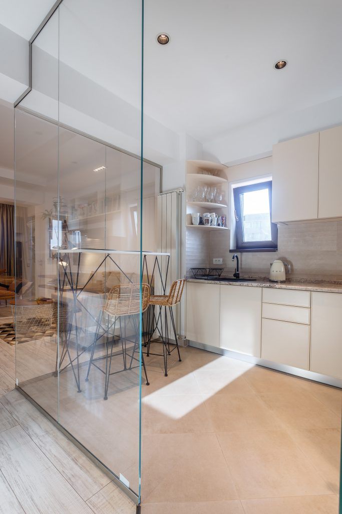Delimitarea rolurilor celor doua camere se face intr-o maniera nonconformista. Spatiul de pregatire si servire a mesei isi regaseste unitatea si unicitatatea in aceeasi masura, separandu-se cu ajutorul sticlei: o optiune moderna de a pastra legatura celor doua incaperi dar si de a izola fonic si olfactiv.