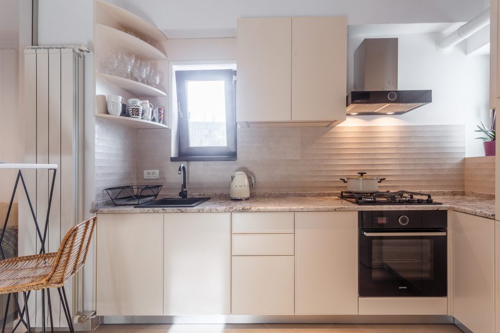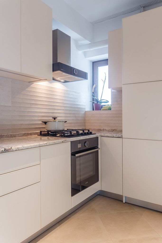 Mobilierul este minimalist, compact, in nuante de alb lucios si impreuna cu masa si scaunele de bar cu design modern, plaseaza bucataria intr-un spatiu temporal de actualitate.
