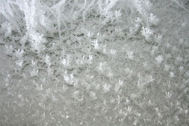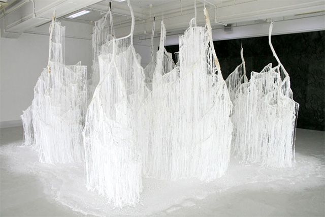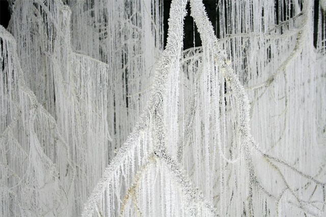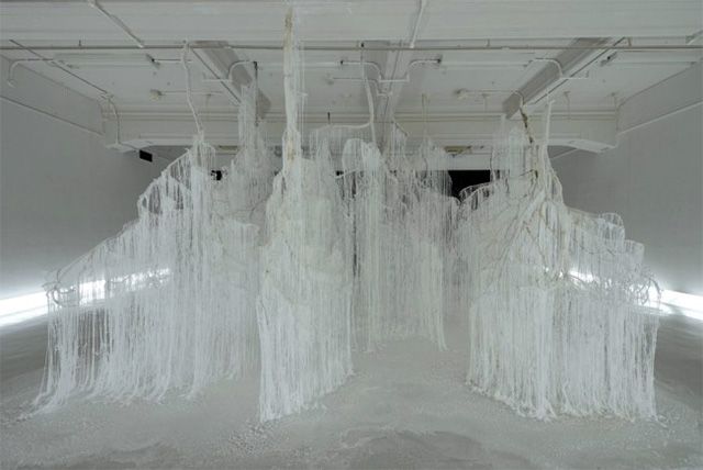Instalatia din crengi de copaci cu silicon si uree cristalizata inrameaza un concept inedit si interesant de privit si de analizat. Intreg “peisajul” arata ca unui iernatic, de parca ar fi niste fulgi de zapada care conecteaza si fac interactiunea intre podea si tavan.