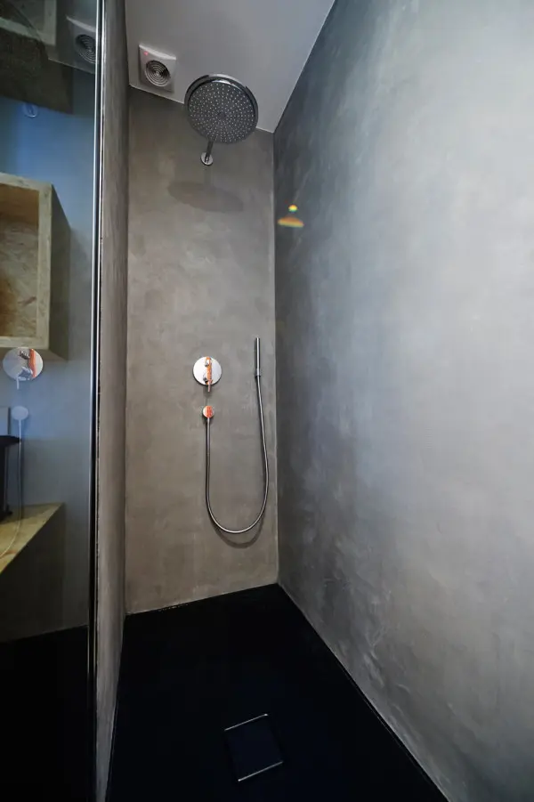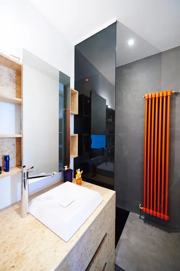 Baia este putin diferita de restul casei in sensul ca are propria ei personalitate. Peretii de culoare gri metalic, cu oglinzi mari, calorifer portocaliu, un lavoar de portelan in stil minimalist. Mobila are o textura speciala (de placaj nefinisat) care dau un aer industrial baii, la fel ca si dusul masiv de inox. O parte a peretelui este din sticla mata, care lasa sa patrunda lumina creand o legatura cu restul casei.