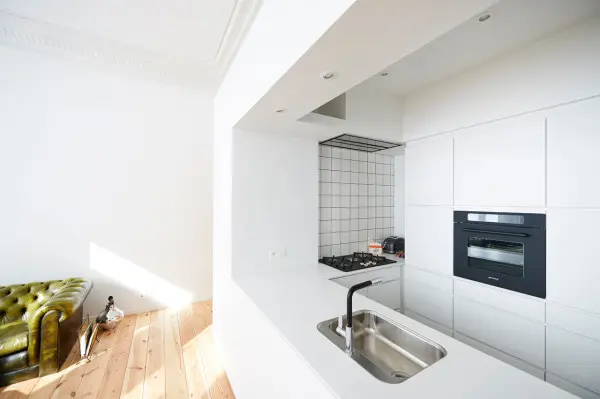 Arhitectii firmei belgiene Axau au reusit sa transforme un apartament banal din Bruxelles, intr-un spatiu modern plin de lumina care te binedispune de la prima vedere. Apartamentul situat intr-o zona destul de buna a orasului, avea un dormitor conectat cu baia, o mica sufragerie cu podea din parchet laminat si tavan fals, si o bucatarie in stilul anilor 70. Intregul spatiu a fost regandit asa ca s-a renuntat la unii dintre peretii despartitori iar bucataria a fost transformata intr-un cub open space care da un aer de originalitate incaperii.