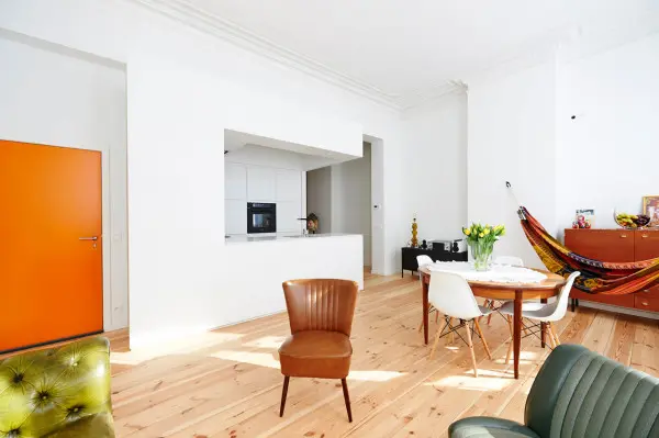 Deschide GaleriaPeretii albi in totalitate (lipsiti de orice tablou sau alt ornament) contrasteaza placut cu celelalte culori vibrante din camera, cu podeaua de scanduri, si fac din aceasta un camin aerisit si plin de lumina. S-au facut unele alegeri indraznete cand vine vorba de culoare. Putem vedea o usa orange care se asorteaza cu caloriferul din baie. In dreptul ferestrei a fost pus un hamac care da un aer boem camerei; parca te imbie sa te asezi in el si sa cazi in visare privind pe fereastra.