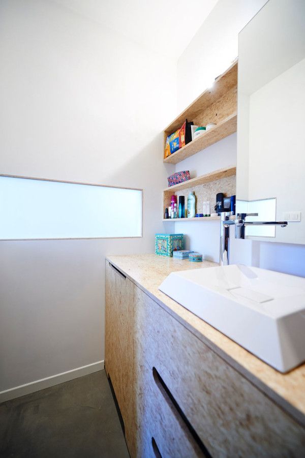 Baia este putin diferita de restul casei in sensul ca are propria ei personalitate. Peretii de culoare gri metalic, cu oglinzi mari, calorifer portocaliu, un lavoar de portelan in stil minimalist. Mobila are o textura speciala (de placaj nefinisat) care dau un aer industrial baii, la fel ca si dusul masiv de inox. O parte a peretelui este din sticla mata, care lasa sa patrunda lumina creand o legatura cu restul casei.