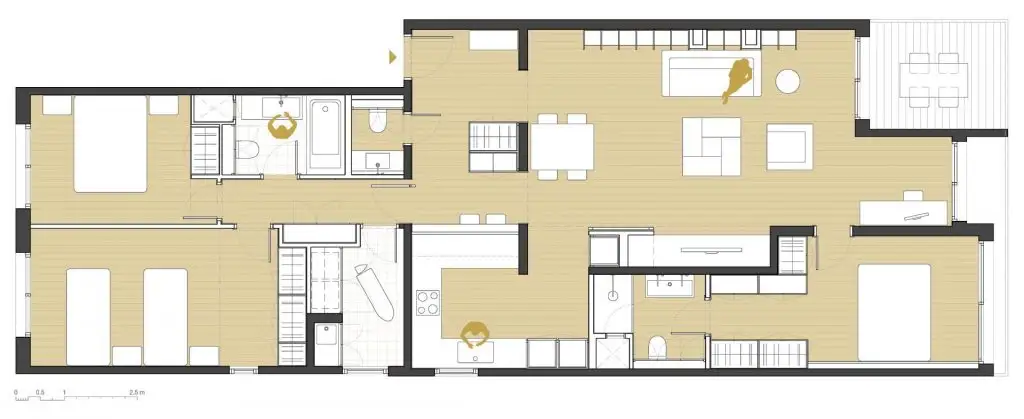 In noua amenajare, bucataria alaturi de camera de zi reprezinta punctul central al casei.Holul de intrare, foarte ingustse deschide in living, unde un perete intreg este organizat ca o biblioteca inzidita, creand astfel un spatiu urias de depozitare.