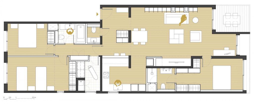 In noua amenajare, bucataria alaturi de camera de zi reprezinta punctul central al casei.Holul de intrare, foarte ingustse deschide in living, unde un perete intreg este organizat ca o biblioteca inzidita, creand astfel un spatiu urias de depozitare.