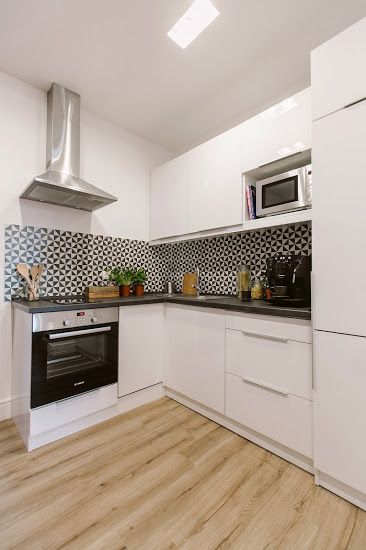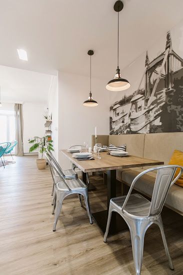 Bucataria este la fel de spatioasa, comunicand direct cu livingul (nu exista usa care sa separe cele doua incaperi). Diningul a fost integrat in spatiul bucatariei din ratiuni practice. O masa lunga completate de scaune in stil industrial si doua corpuri suspendate ofera spatiul necesar pentru un grup mai mare care decide sa inchirieze intreg apartamentul. Fototapetul ilustrand unul din podurile celebre de peste Dunare din Budapesta, completeaza intr-un mod original incaperea.