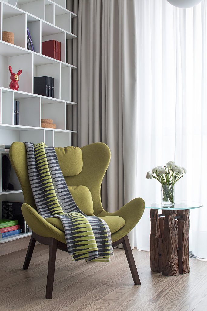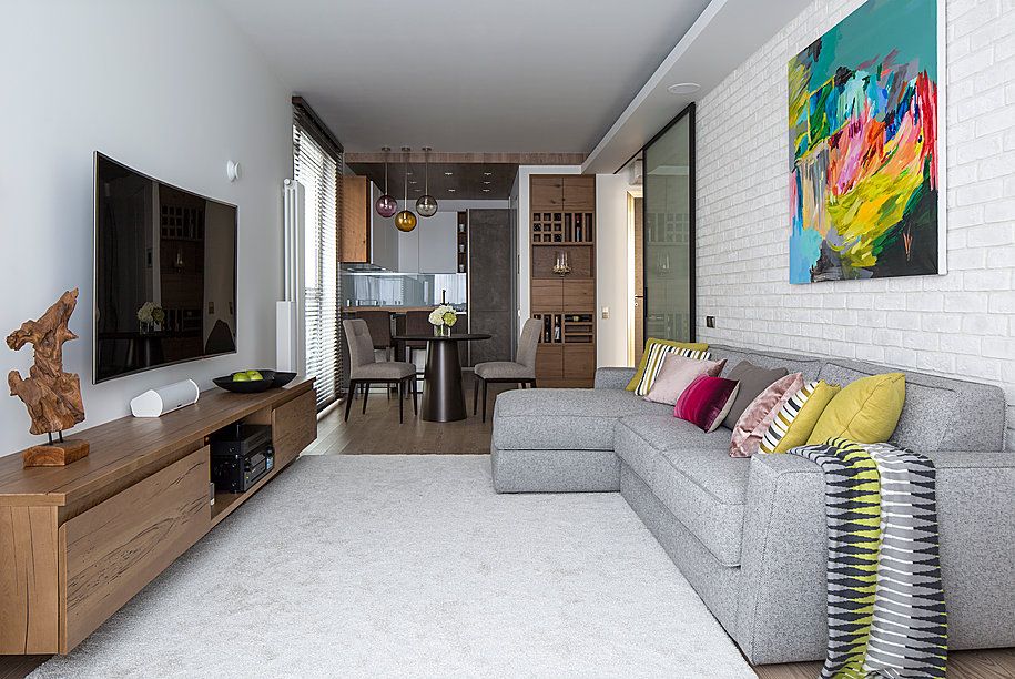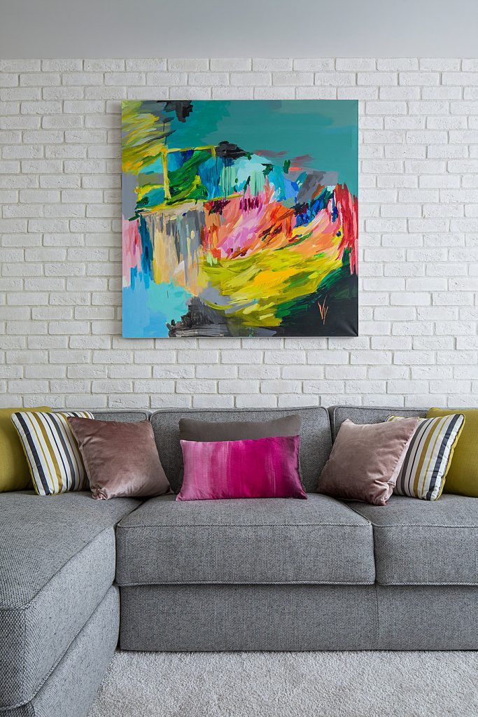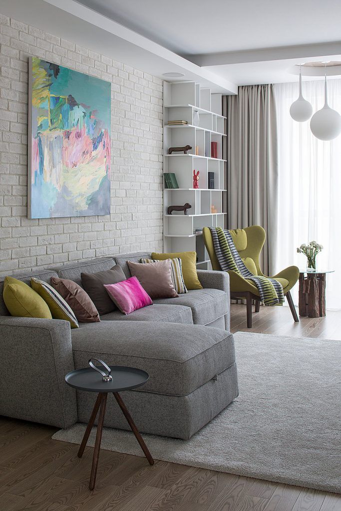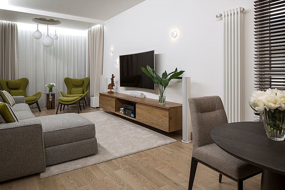 Spatiul este luminos si aerisit gratie unor finisaje in nuante deschise, iar insertiile de gri, bej si verde-oliv imbogatesc cromatica. Tabloul de pe peretele cu canapeaua atrage atentia prin culori abundente, iar fundalul alb reuseste sa-l puna in valoare.