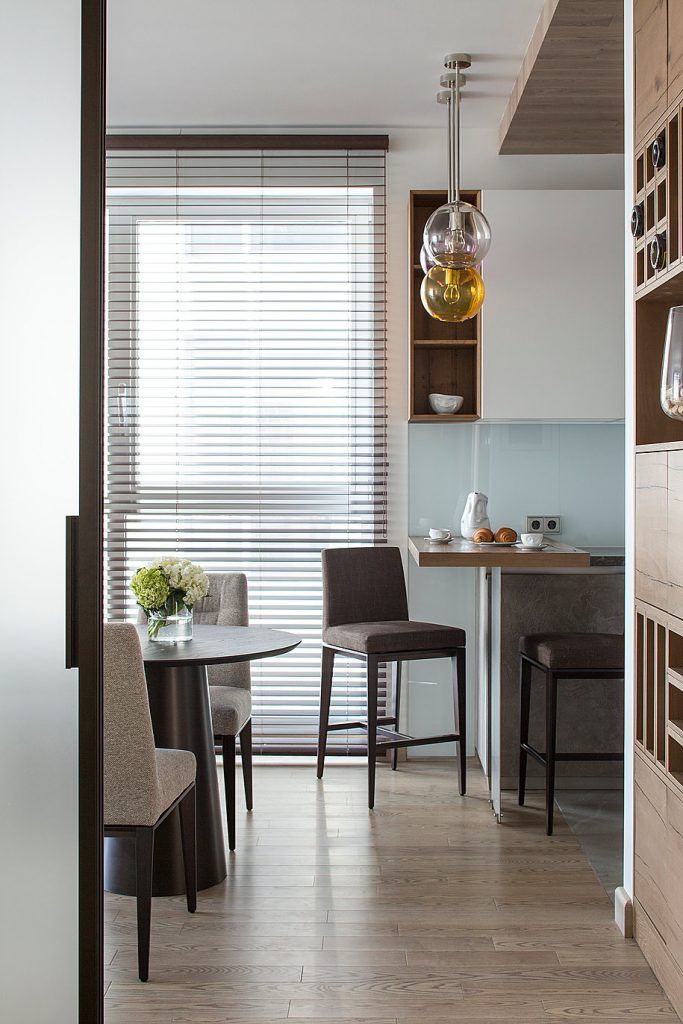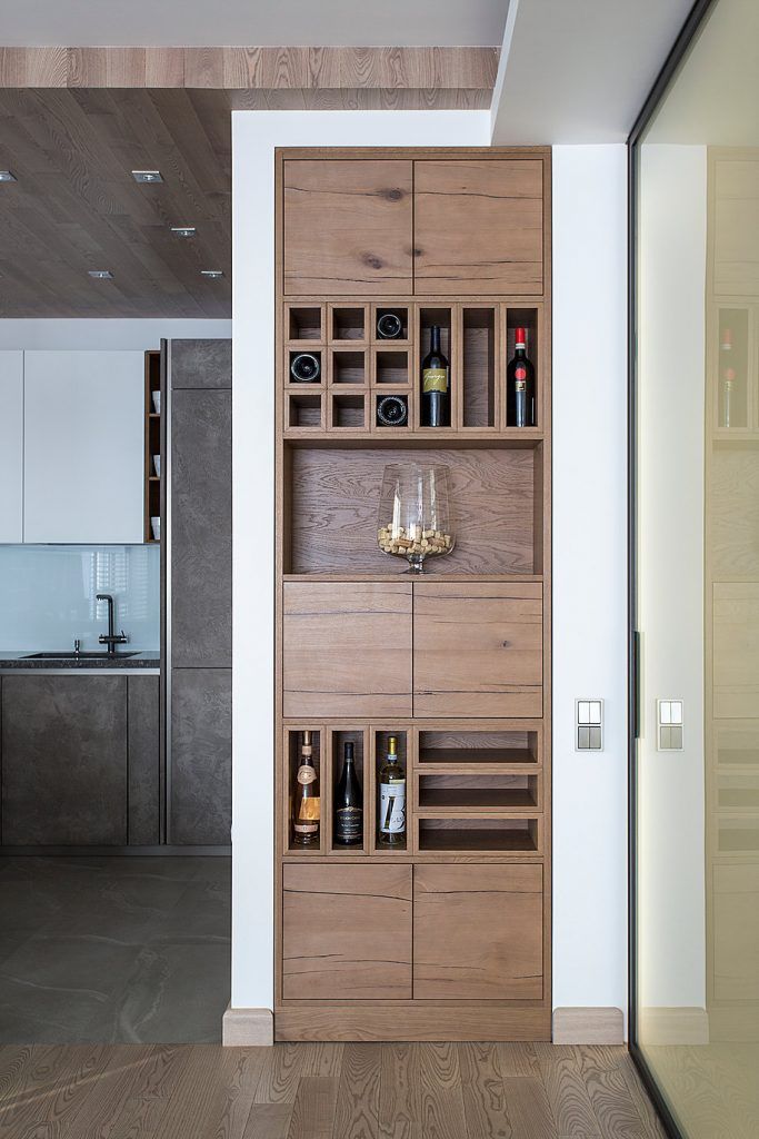 Spatiul destinat bucatariei este destul de restrans. Intr-o nisa a fost incastrate spatii variate de depozitare, iar electrocasnicele incorporate pentru a spori unitatea amenajarii. Designul este simplu, cu suprafete lucioase, iar blatul tip bar separa bucataria de restul incaperii. Finisajele sunt de inalta calitate, iar executia exemplara. Urmareste doar detaliile de la nivelul pardoselii, a tavanului fals unde sunt inserate spoturile sau corpul de mobilier destinat suporturilor de vinuri.