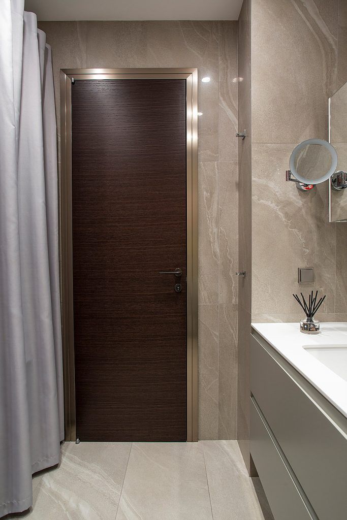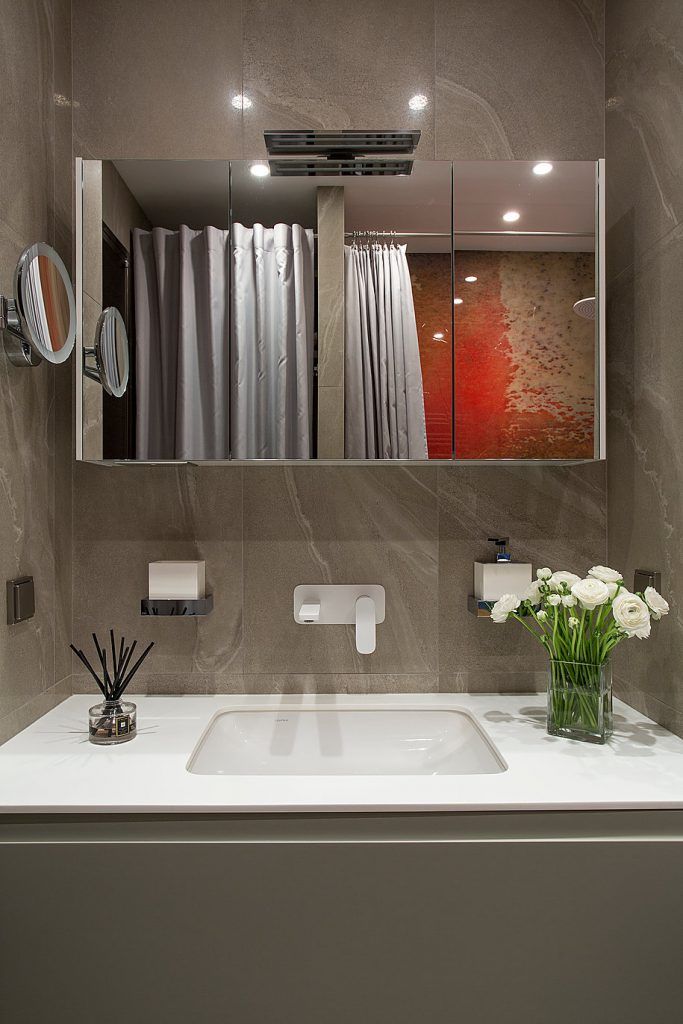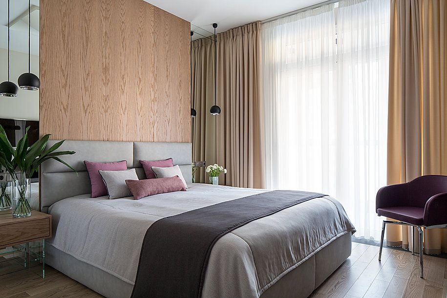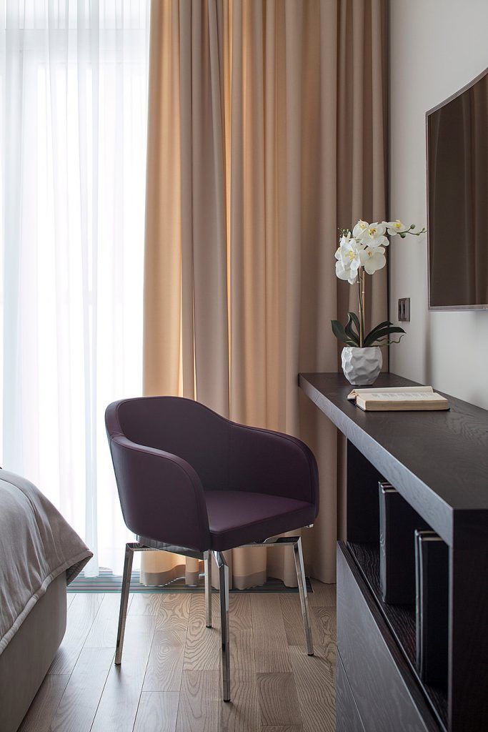 In dormitor, vom gasi aceeasi amplasare a oglinzilor, de o parte si cealalta a patului, pe mijloc peretele fiind placat cu lemn. Decorul este elegant amenajat, fara a omite nicio clipa functionalitatea. Si aici vom gasi dulapuri inalte precum cele din hol, dar si un corp folosit pe post de comoda si birou, prin prelungirea blatului spre fereastra. Desi spatiul este mic, amenajarea asigura confortul necesar, fara a aglomera incaperea.