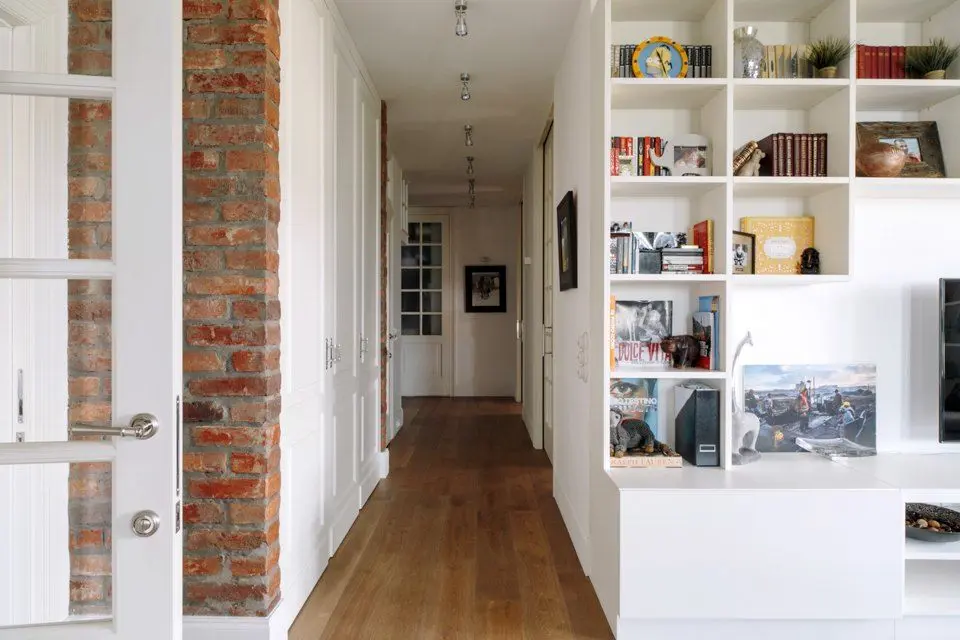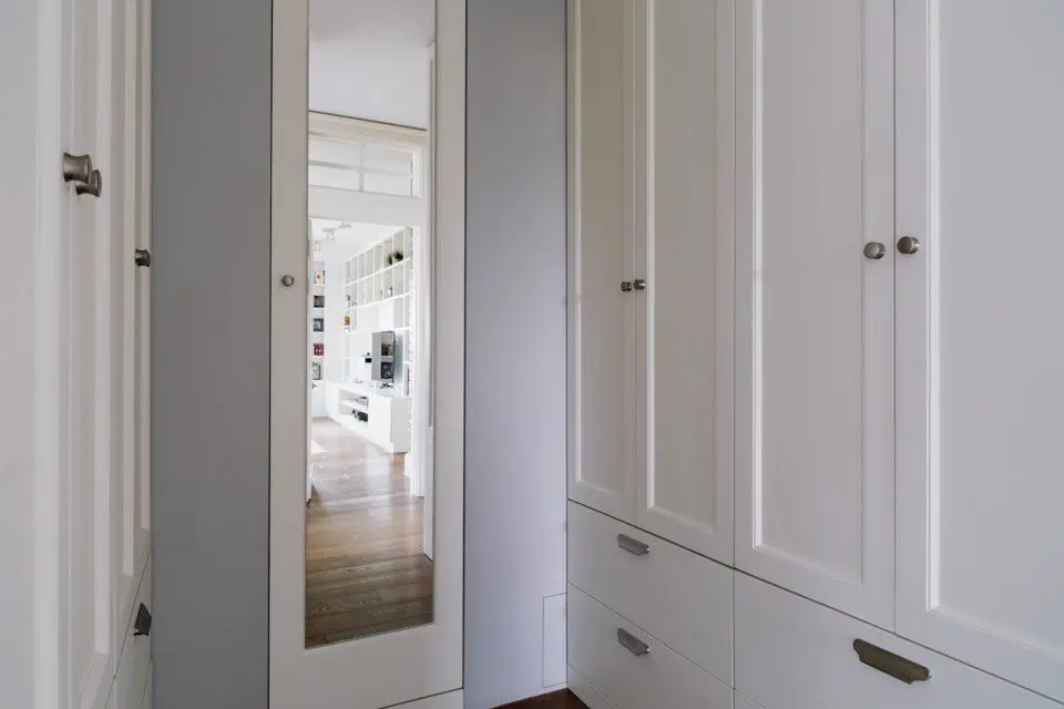 Camera se bucura de ferestre generoase ceea ce face ca lumina naturala sa patrunda din belsug, iar albul predominant sa sporeasca senzatia de spatialitate. In acelasi scop, s-a optat pentru usi glisante din sticla pe care le regasim in aproape toate incaperile, exceptie facand baile. Efectul obtinut este de un plus de luminozitate si la nivelul holului.