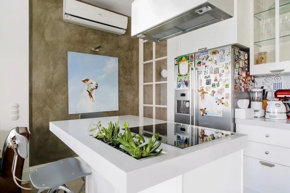 Pentru bucatarie a fost gandita o amenajare pe doua laturi, cu o zona principala si una secundara, destinata electrocasnicelor si depozitarii. Si aici linia mobilierului imprumata din minimalismul pe care il regasim in spatiul livingului, cu un design simplu, functional. Un corp tip insula de bucatarie joaca dublu rol: pentru gustari rapide, zona de bar si zona de gatit, avand plita incorporata si o hota pe masura.