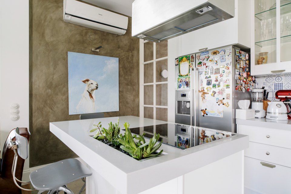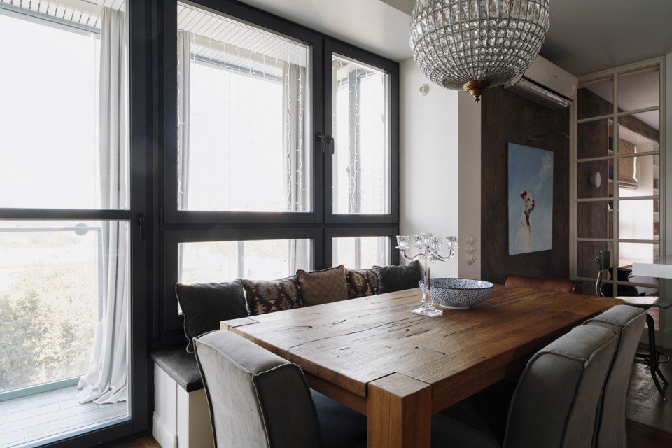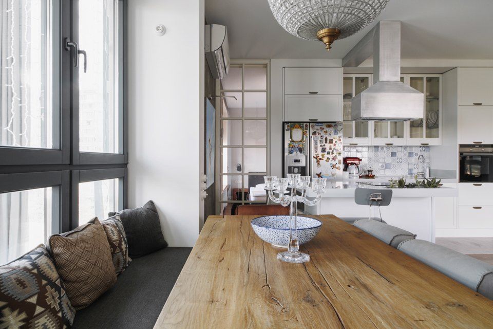 Eliminarea partitiei dintre living si bucatarie a permis o redistribuire a zonelor, putand fi integrat si un dining, amenajat in jurul unei alte ferestre, cu masa din lemn masiv, scaune si bancuta cu multe perne moi.