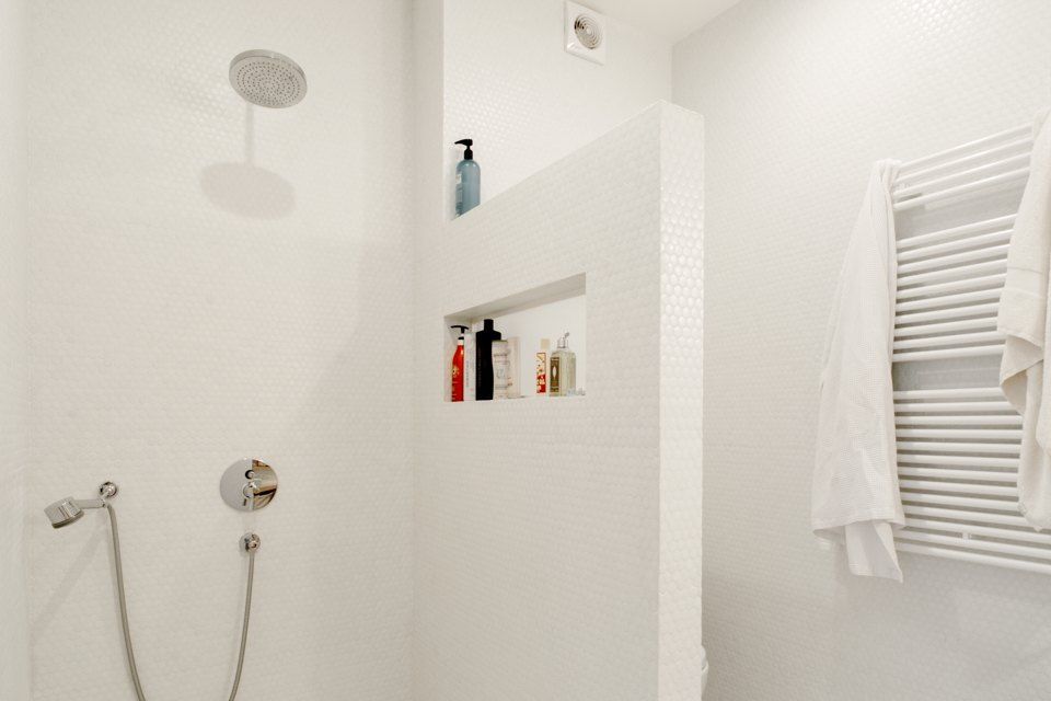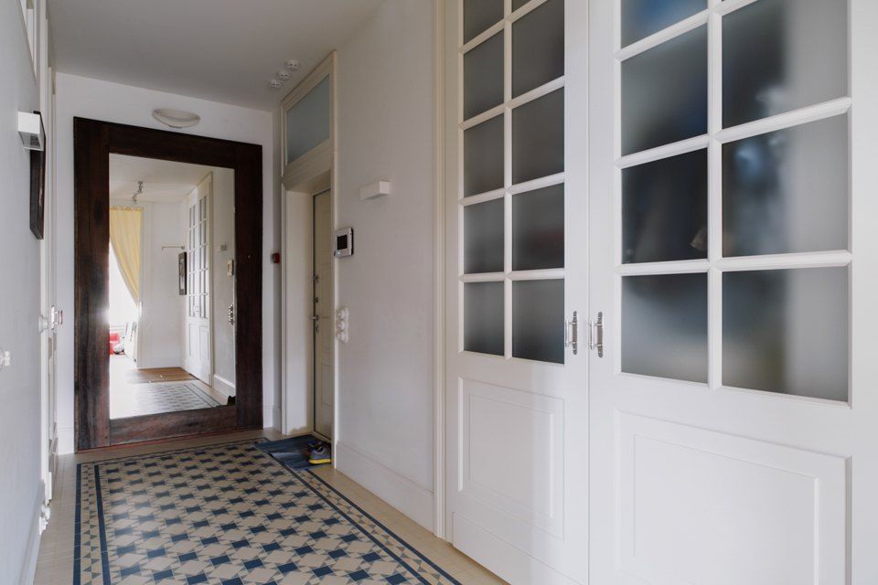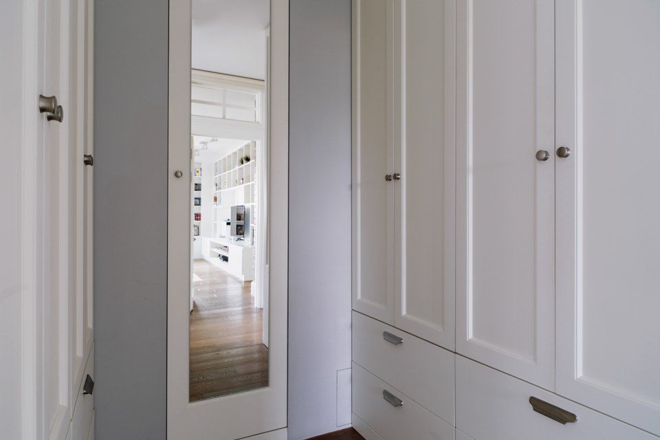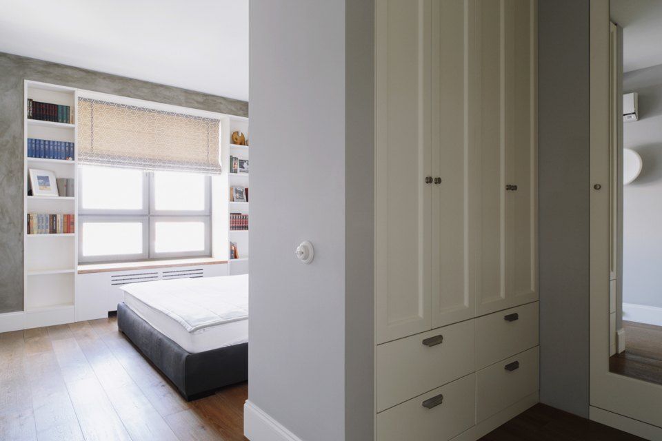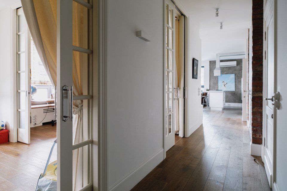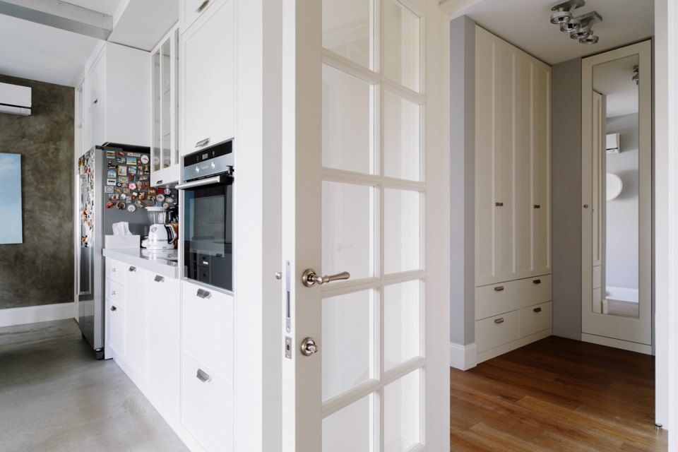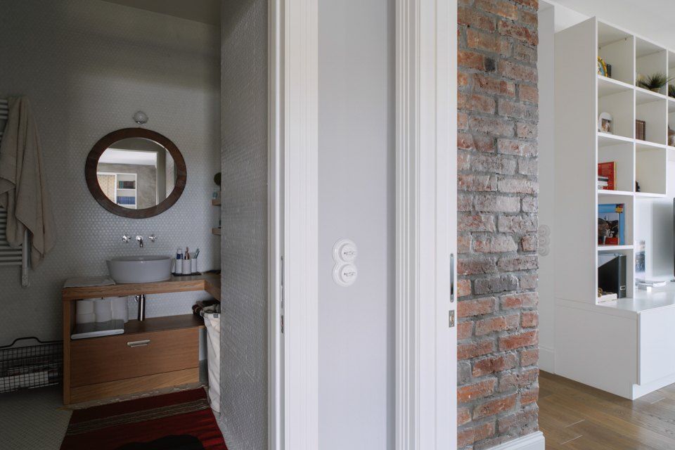 Camera se bucura de ferestre generoase ceea ce face ca lumina naturala sa patrunda din belsug, iar albul predominant sa sporeasca senzatia de spatialitate. In acelasi scop, s-a optat pentru usi glisante din sticla pe care le regasim in aproape toate incaperile, exceptie facand baile. Efectul obtinut este de un plus de luminozitate si la nivelul holului.