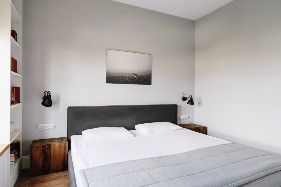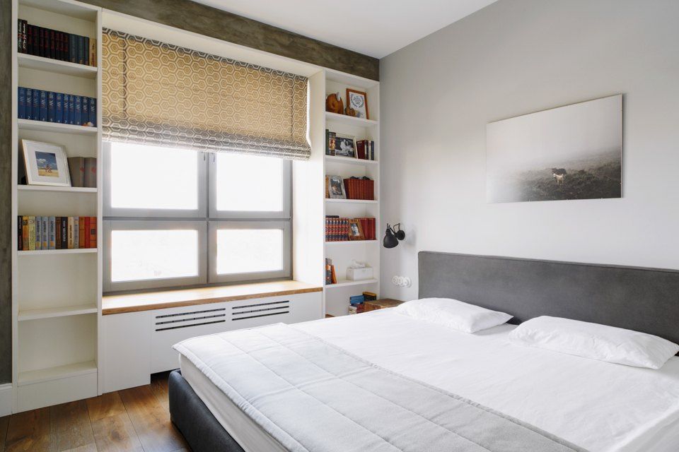 In dormitor, se reia spiritul minimalist al amenajarii. Zona centrala este ocupata de pat, iar de jur imprejurul ferestrelor amenajate, din nou, doua corpuri pentru carti, alaturi de dulapuri pentru incaltamine si haine.
