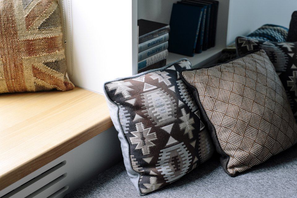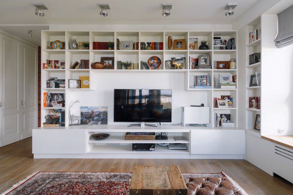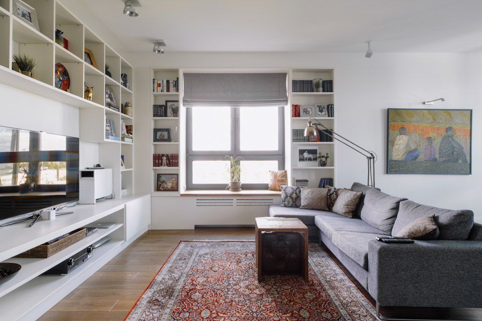 Zona de zi a fost gandita pentru momentele de reuniune si socializare, pe scurt, de petrecut timp impreuna. Astfel, designerul a integrat o canapea confortabila tip coltar si un corp mare de biblioteca ce include si o zona T V. De asemenea, in jurul ferestrei, au mai fost incastrate doua corpuri mai restranse destinate tot depozitarii cartilor si a altor decoratiuni, iar glaful transformat intr-un mic spatiu de sezut.