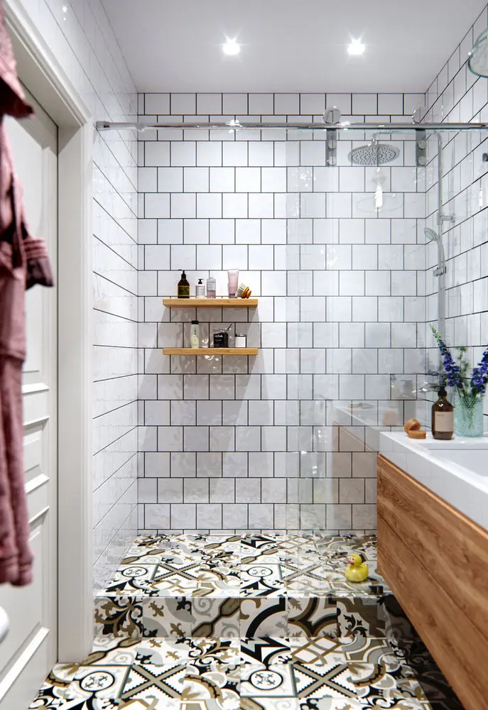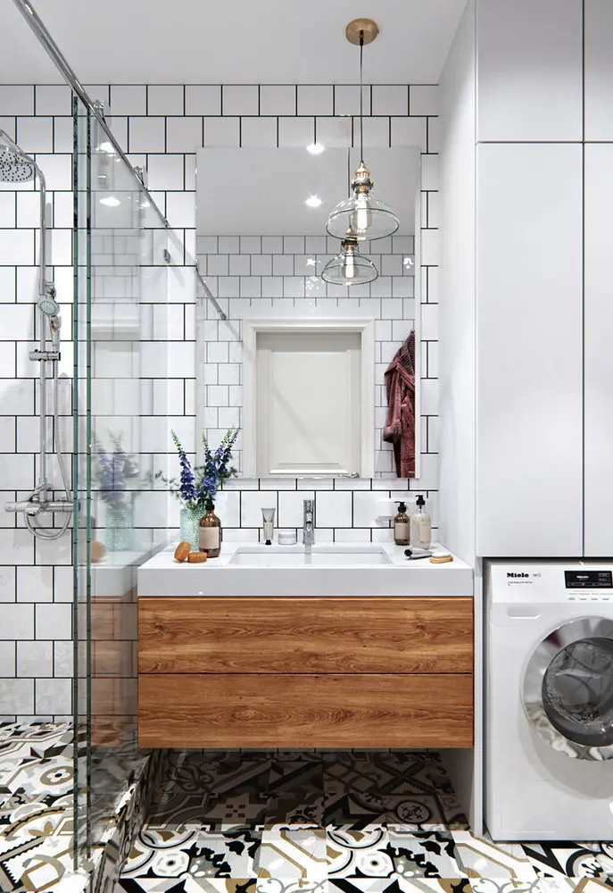 Pentru baie s-au folosit aceleasi placi decorative pe care le regasim si in hol. Masina de spalat rufe a fost integrata intr-o nisa cu spatii de depozitare generoase. Pentru o utilizare optima a spatiului, a fost gandita o zona de dus tip walk-in, iar corpul de sub lavoar este suspendat, lasand cat mai mult spatiu la nivelul pardoselii.