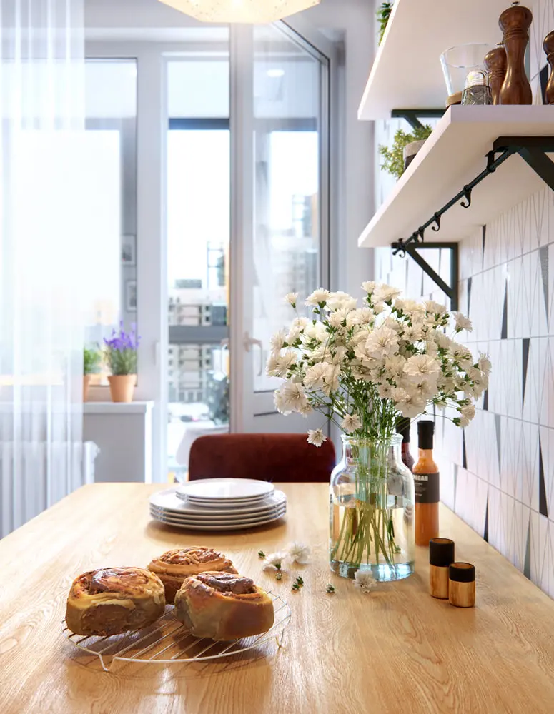 De aceea, designerii nu au intampinat probleme in a integra spatii de depozitare, iar bucataria a ramas camera de sine statatoare (in spatiile mici si acolo unde se poate, bucataria se uneste cu livingul pentru a crea o incapere mai spatioasa).