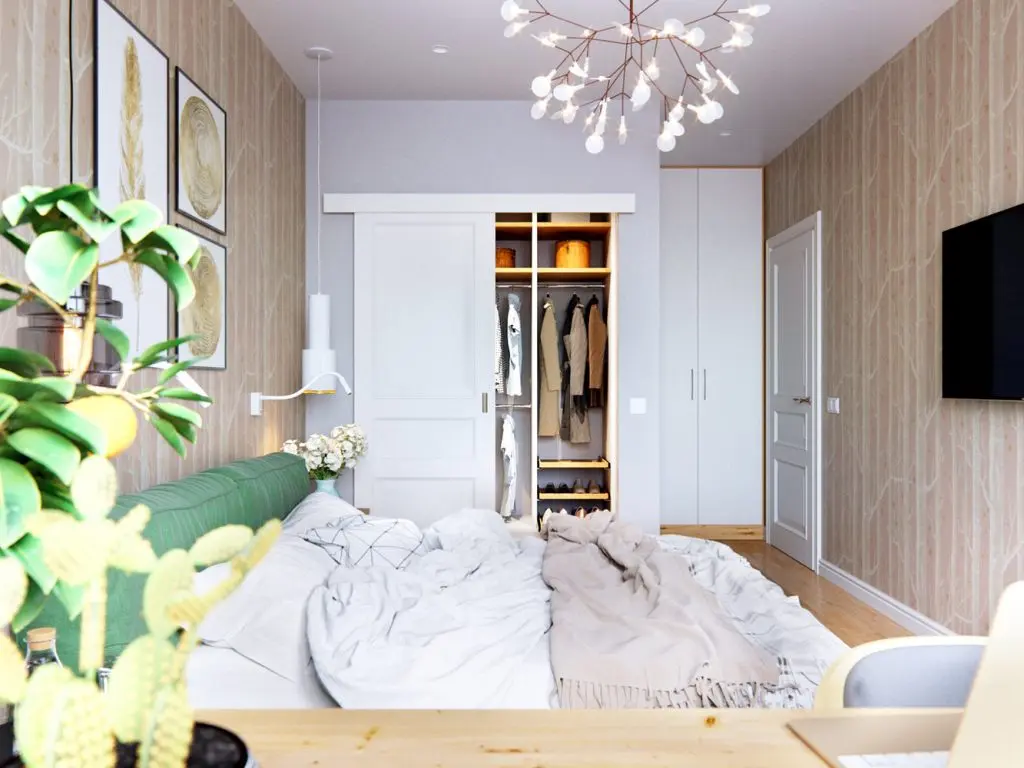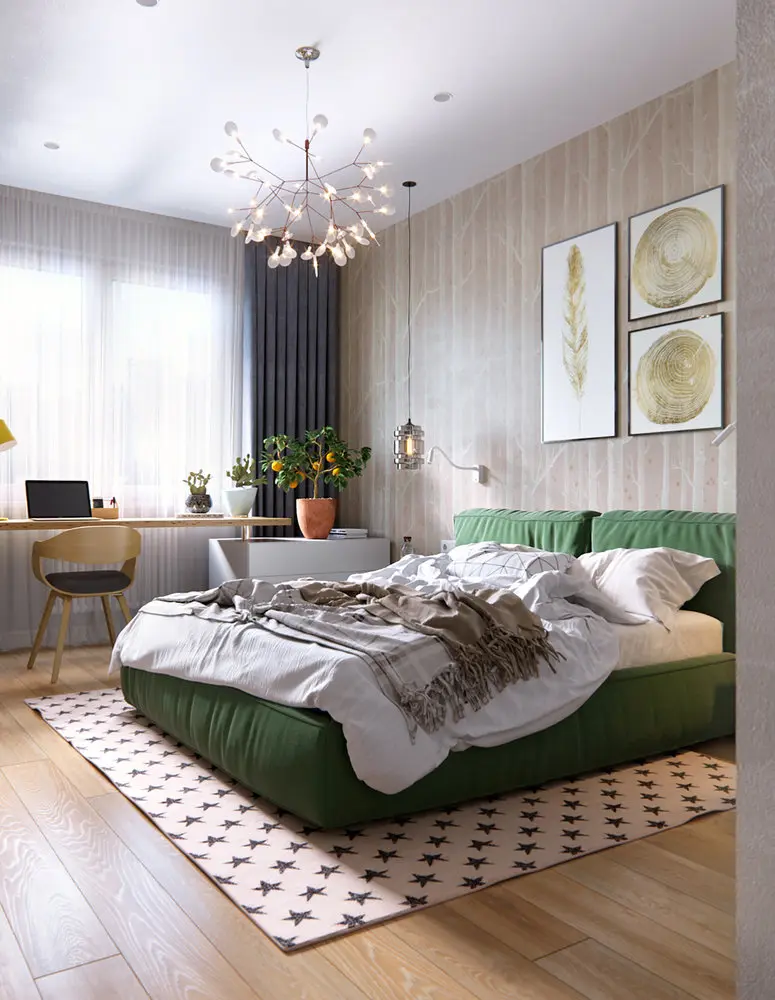 Nu e deloc intamplatoare nici alegerea covorului cu stelute sau a corpului de iluminat care ne aminteste de ramurile unui copac! Designerul a integrat excelent si functionalul in aceasta amenajare: cele doua dulapuri de la intrarea in camera asigura suficient spatiu pentru depozitare necesare ambilor parteneri. La fereastra a fost gandit un spatiu pentru lucrul de acasa.