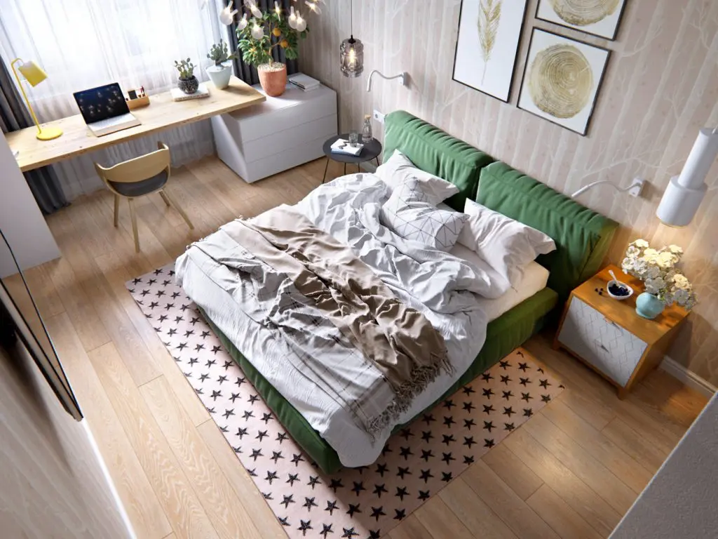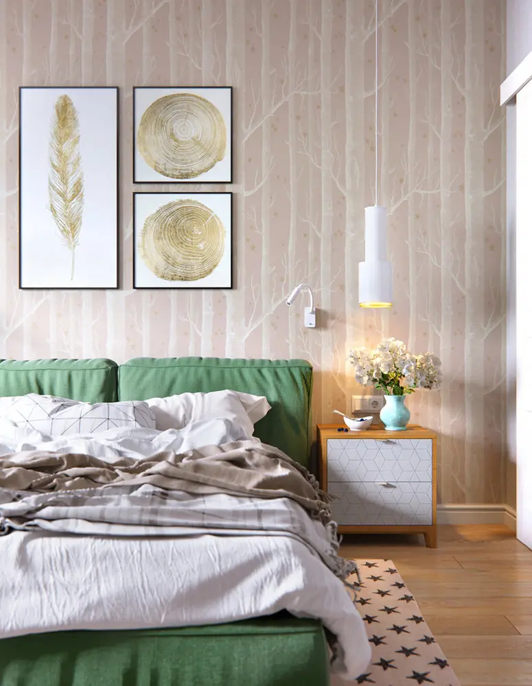 Decorul dormitorului pare desprins din natura: patul verde, tapetul cu trunchiuri de copaci, esenta de lemn a parchetului, blatul de lemn care joaca rol de birou, precum si tablourile, toate reusesc sa compuna un ambient odihnitor, relaxant.