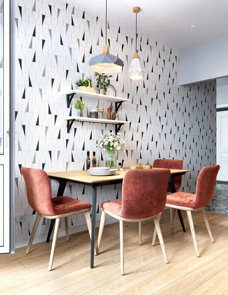 Bucataria completeaza excelent stilistica amenajarii. Se continua motivele grafice la nivelul tapetului care decoreaza intreg peretele cu masa, al draperiilor sau al placilor de faianta dintre corpurile de mobilier.