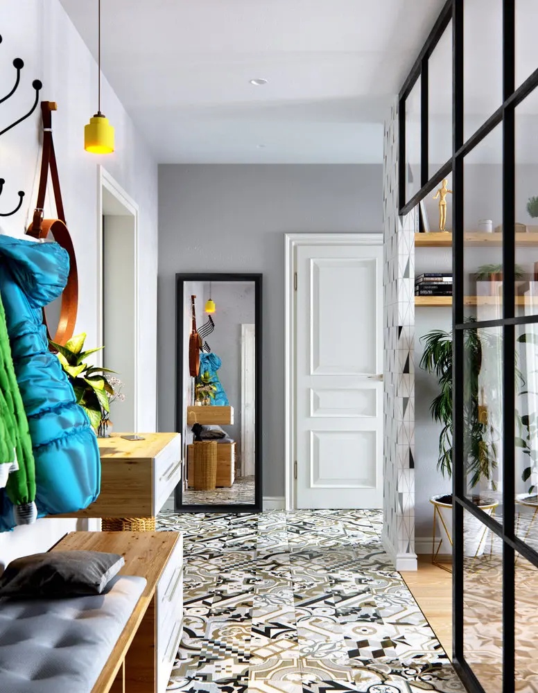 Una din modificarile notabile realizata in aceasta amenajare este cea a eliminarii peretelui dintre living si hol si inlocuirea lui cu o structura tip glasvand. Astfel, lumina naturala patrunde si in hol, creand continuitate intre cele doua functiuni.
