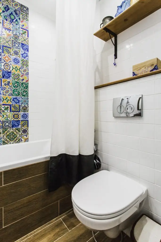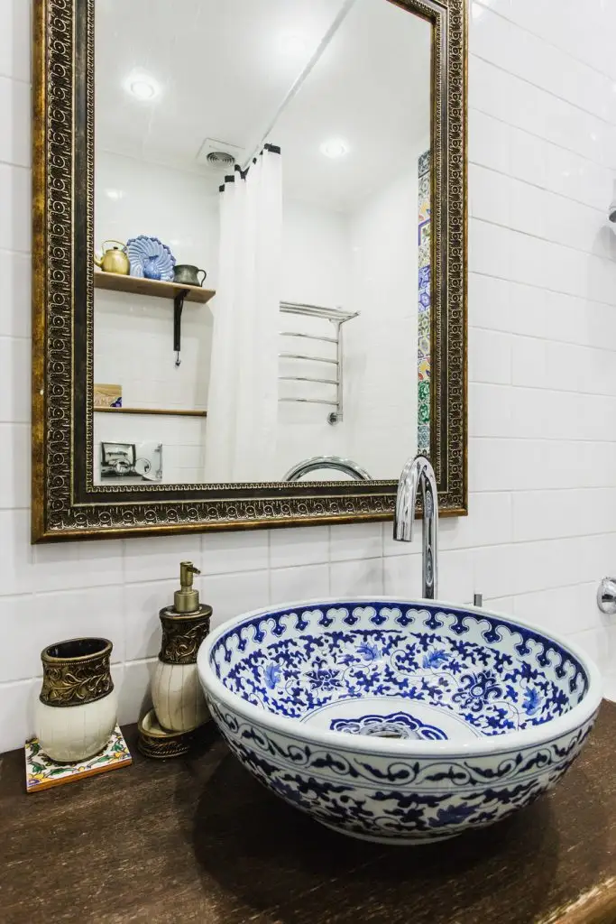 In baie, Maria a mers pe un stil jucaus si vintage in acelasi timp. Rama oglinzii, recipientul pentru sapun lichid, suportul pentru periute impreuna cu blatul lavoarului sunt piesele de rezistenta ale acestei bai. In aceeasi masura, iti vor placea placile colorate in stil patchwork si lavoarul pictat absolut superb! Cea mai frumoasa baie mica pe care am vazut vreodata!