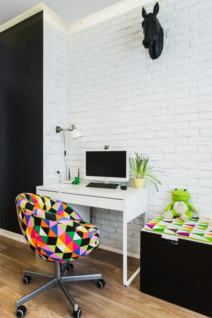 De remarcat simplitatea elementelor si armonia pe care Maria a reusit sa o contureze luand in calcul spatiul mic pe care l-a avut la dispozitie. Tiparul geometric se regaseste discret in fiecare zona – pe canapea sub forma pernelor decorative, pe lada, tapiteria scaunului de birou si placile ceramice din bucatarie.