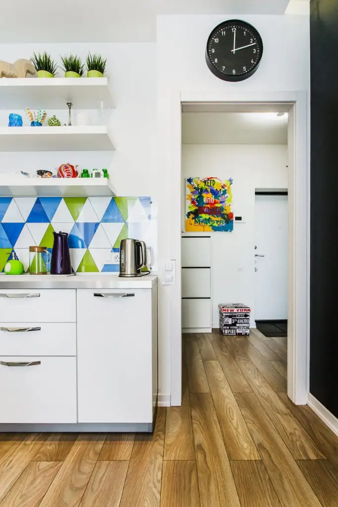 Bucataria este simpla si face parte din aceeasi camera. Cu o configuratie tip L, spatiul pentru gatit atrage privirea prin acel joc de figuri geometrice aplicate pe placile ceramice. Asortarea cu o parte a decoratiunilor este chiar placuta vizual.