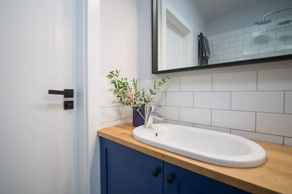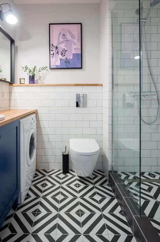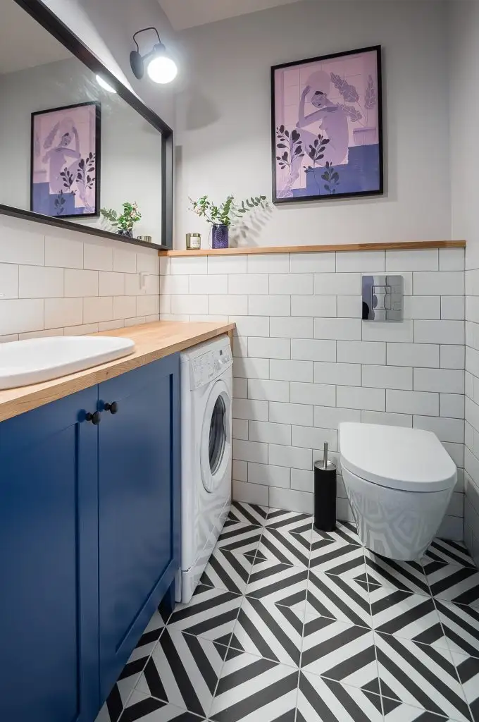 Chiar si in baie a fost prevazut un spatiu pentru depozitare imediat sub lavoar, incluzand si masina de spalat rufe.